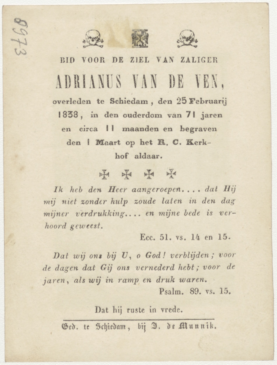 Laat ons dikmaals aan gedenken, kz. Bid voor ziel Van de Ven (+1838) Schiedam