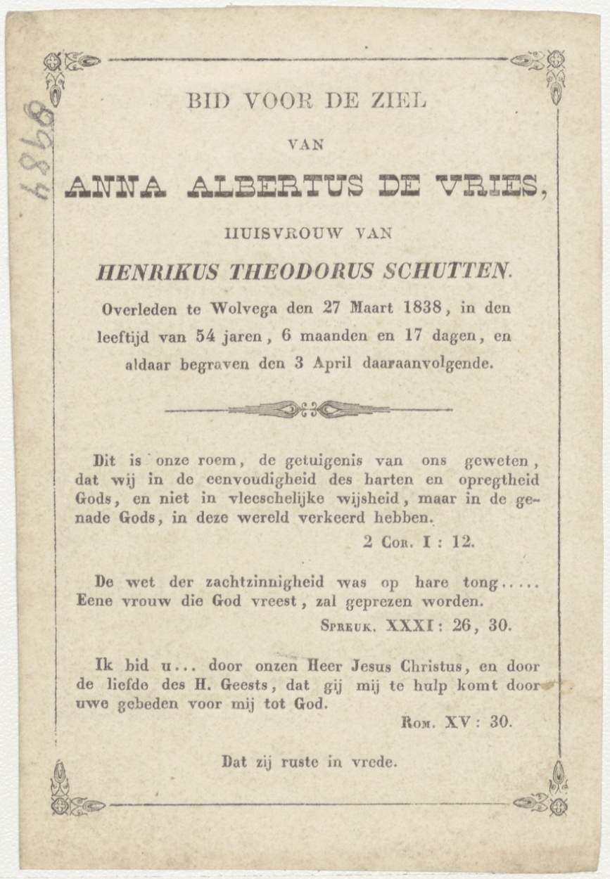 God openbaart zich in het leven (Frans), kz. Bid voor ziel Schutten (+1838) Wolvega