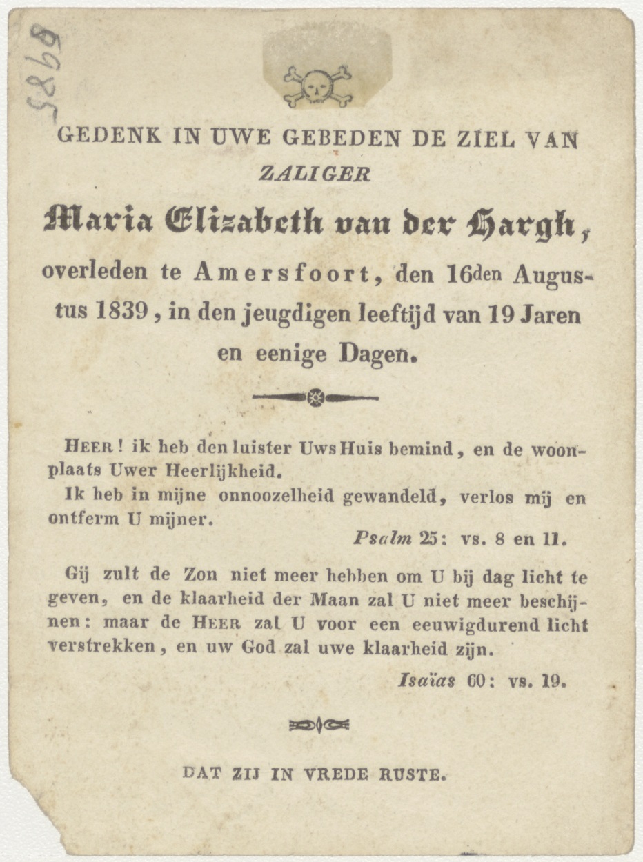 Zandloper en kelk, de vermaken vlieden en de mure des doods is onbekend, kz. Bid voor ziel Van der Hargh (+1839) Amersfoort