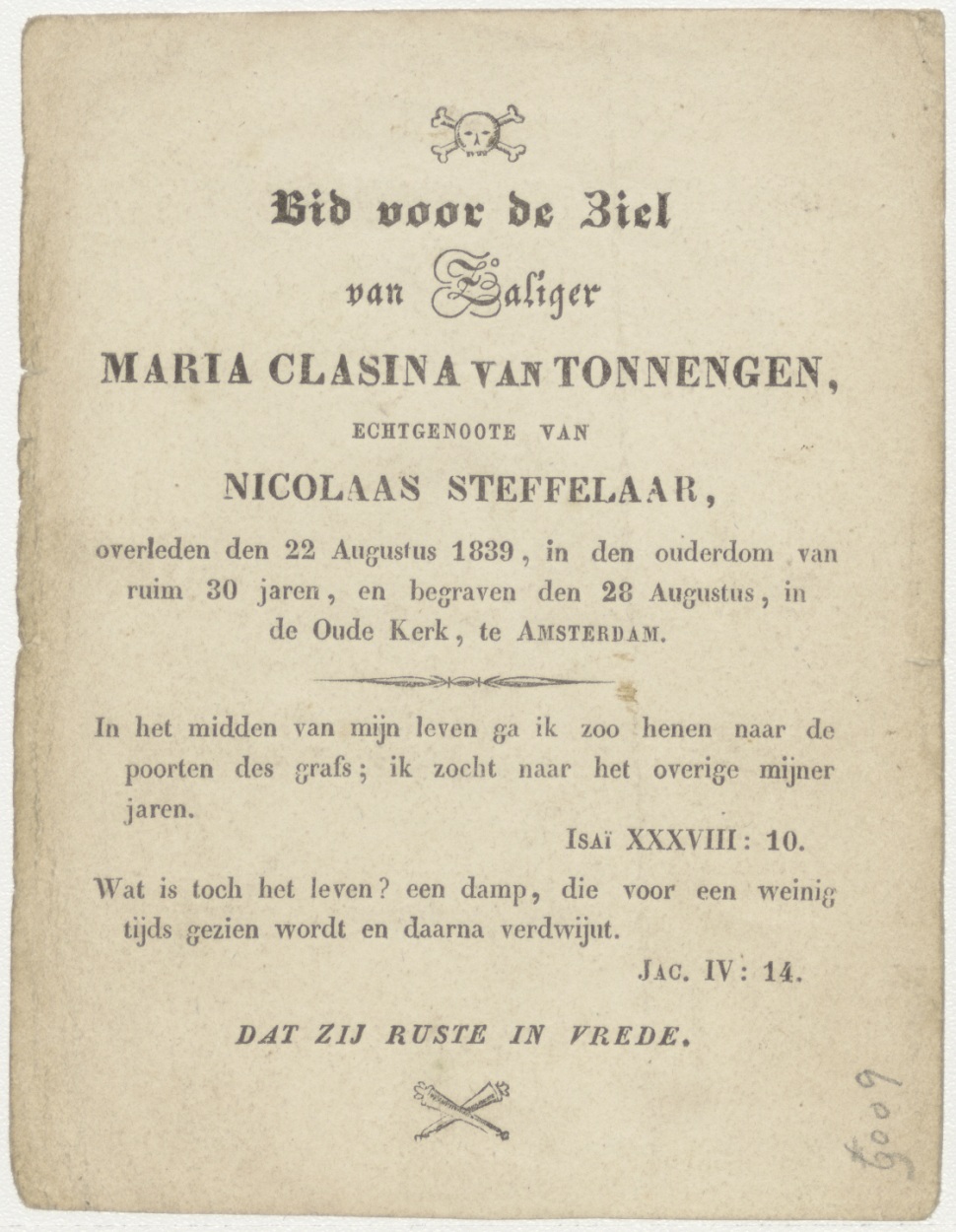Christus ontmoet zijn moeder, kz. Bid voor ziel Van Tonnengen-Steffelaar (+1839) Amsterdam