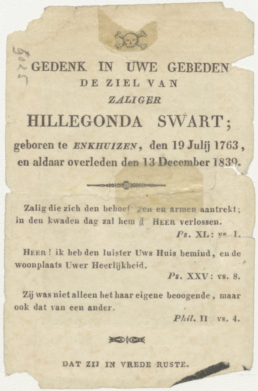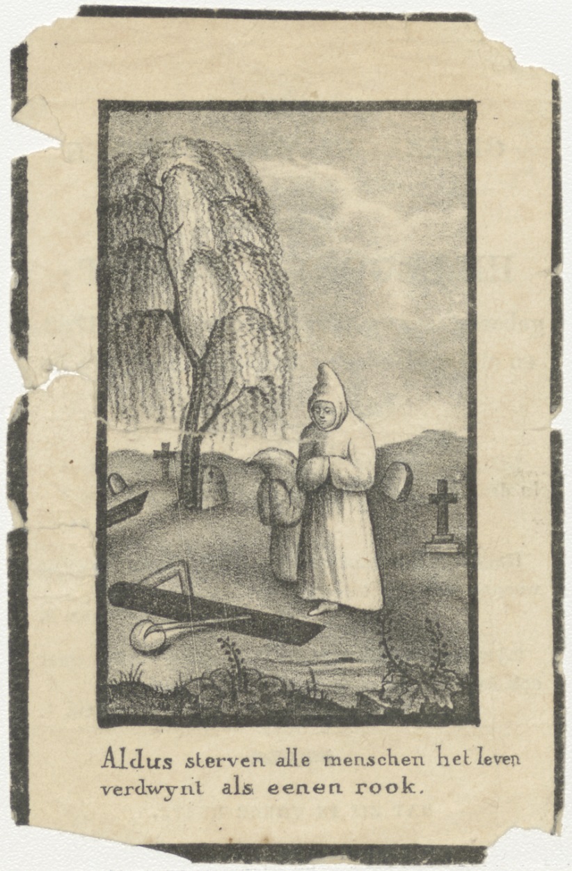Monikken op kerkhof, aldus sterven alle menschen het leven verdwijnt als eenen roos, kz. Bid voor ziel Swart (+1839) Enkhuizen