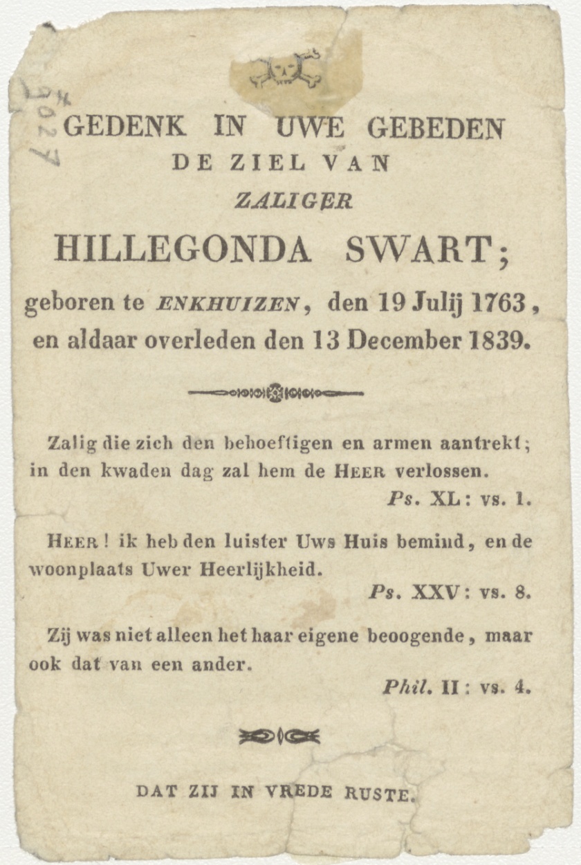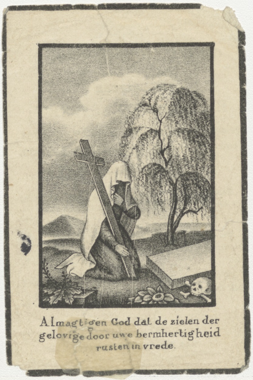 Man op kerkhof; almagtigen God dat de zielen gelovige door uwe bermhertelijkheid..., kz. Bid voor ziel Swart (+1839) Enkhuizen