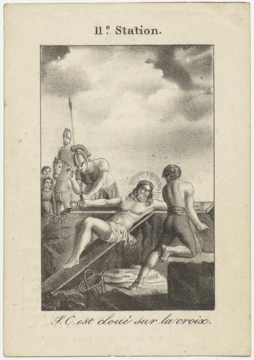 Passiescène (11e statie) Christus wordt aan het kruis genageld (Frans), kz. Religieus; bid voor ziel Franciscus van Os (+1839) pastoor buiten de waardpoort te Utrecht