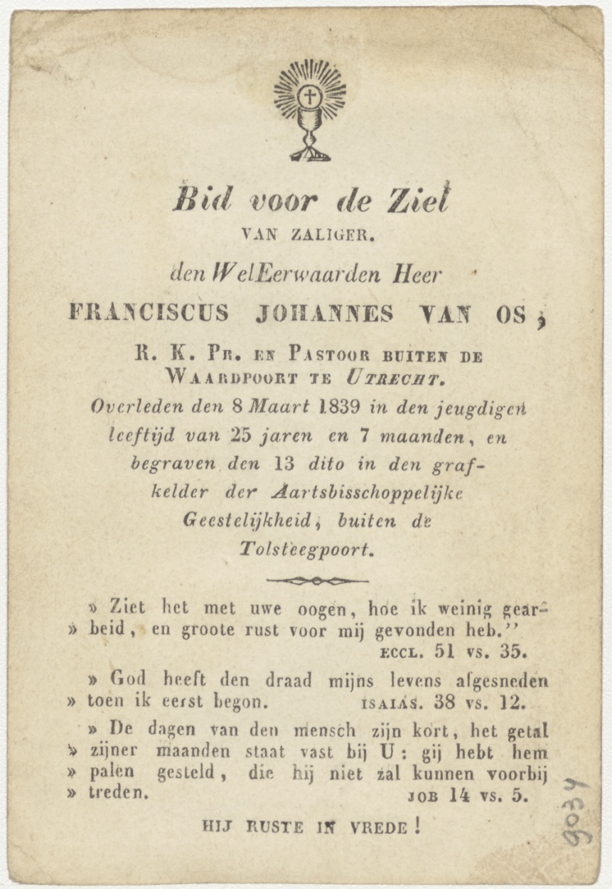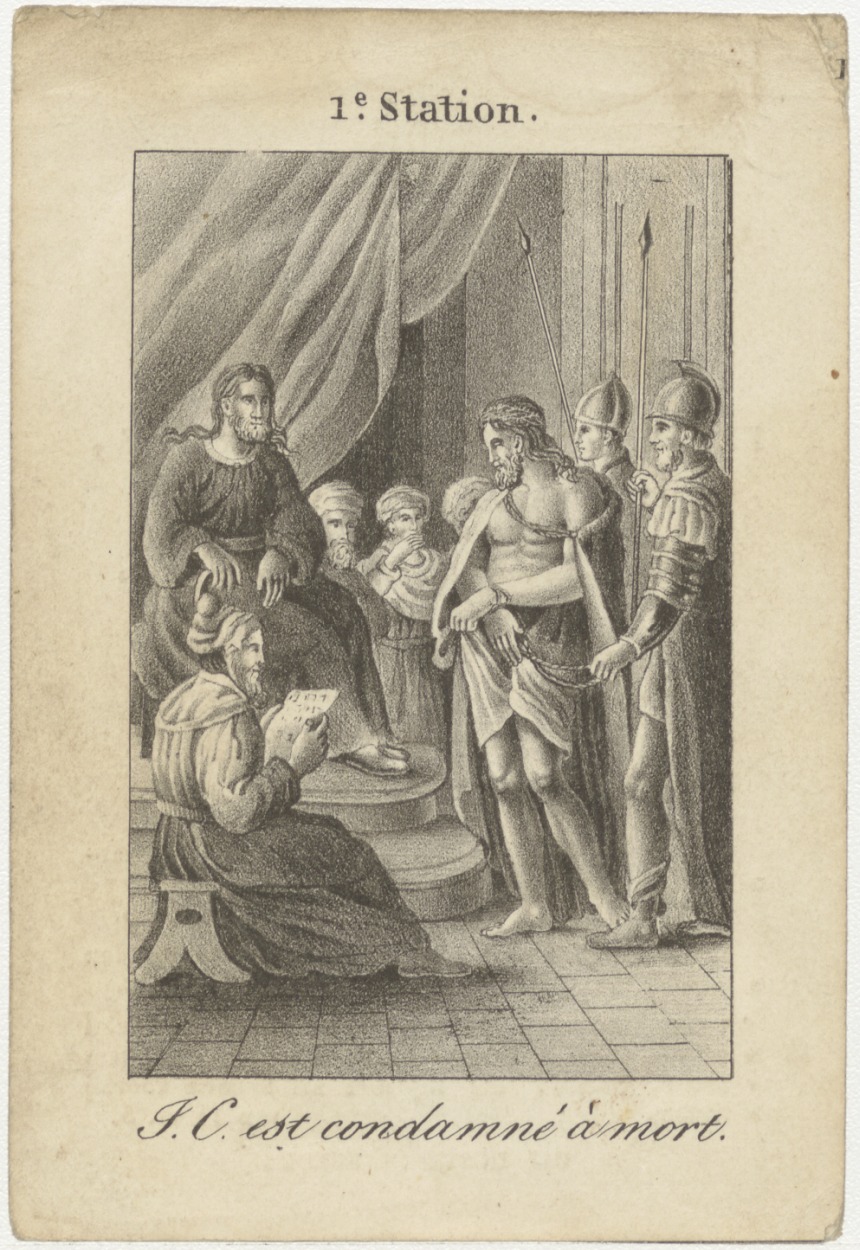 Passiescène (1e statie) Christus wordt ter dood veroordeeld, kz. Religieus; bid voor ziel Franciscus van Os (+1839) pastoor buiten de waardpoort te Utrecht