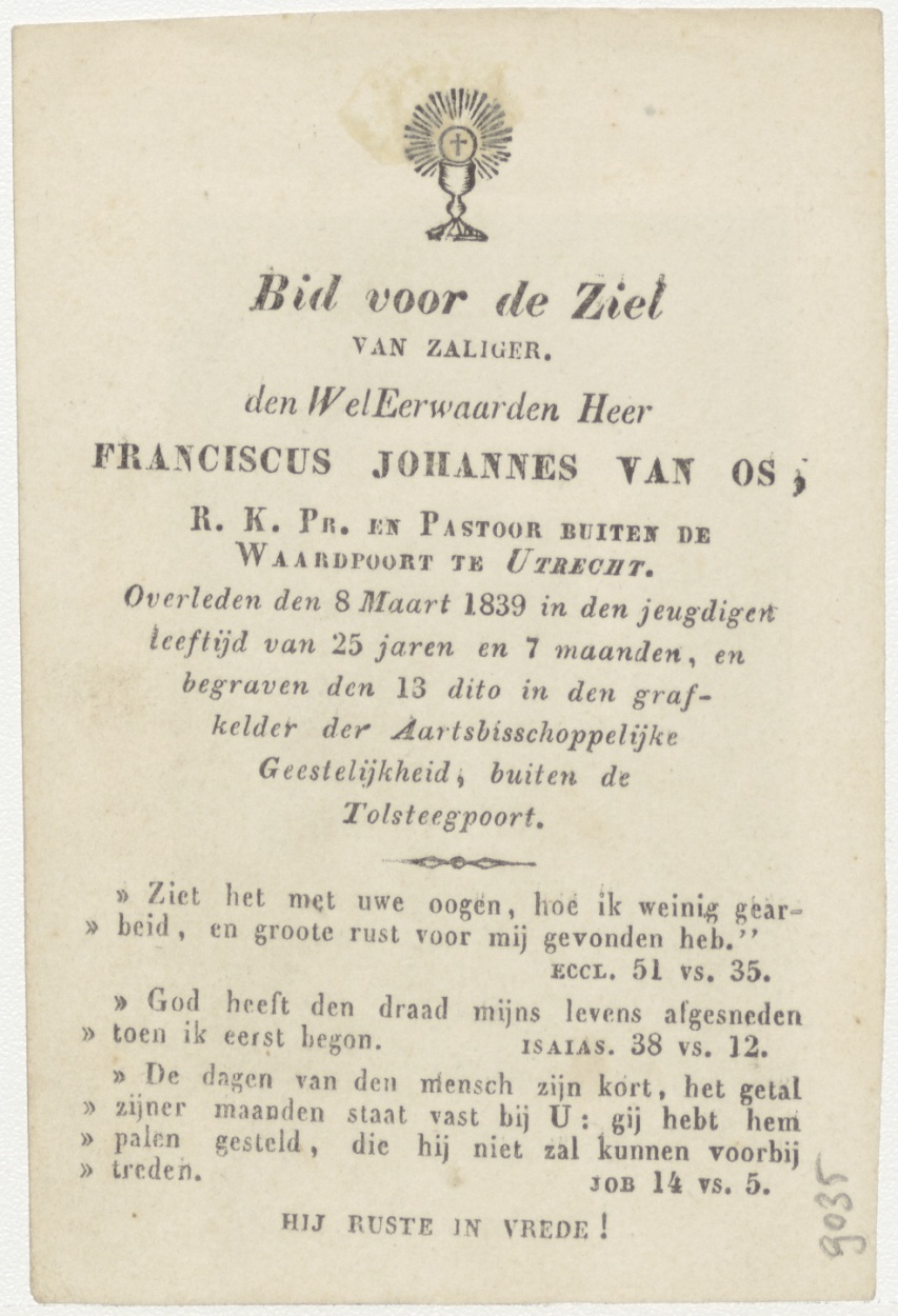 Maria, Mater Dolorosa, kz. Religieus; bid voor ziel Franciscus van Os (+1839) pastoor buiten de waardpoort te Utrecht