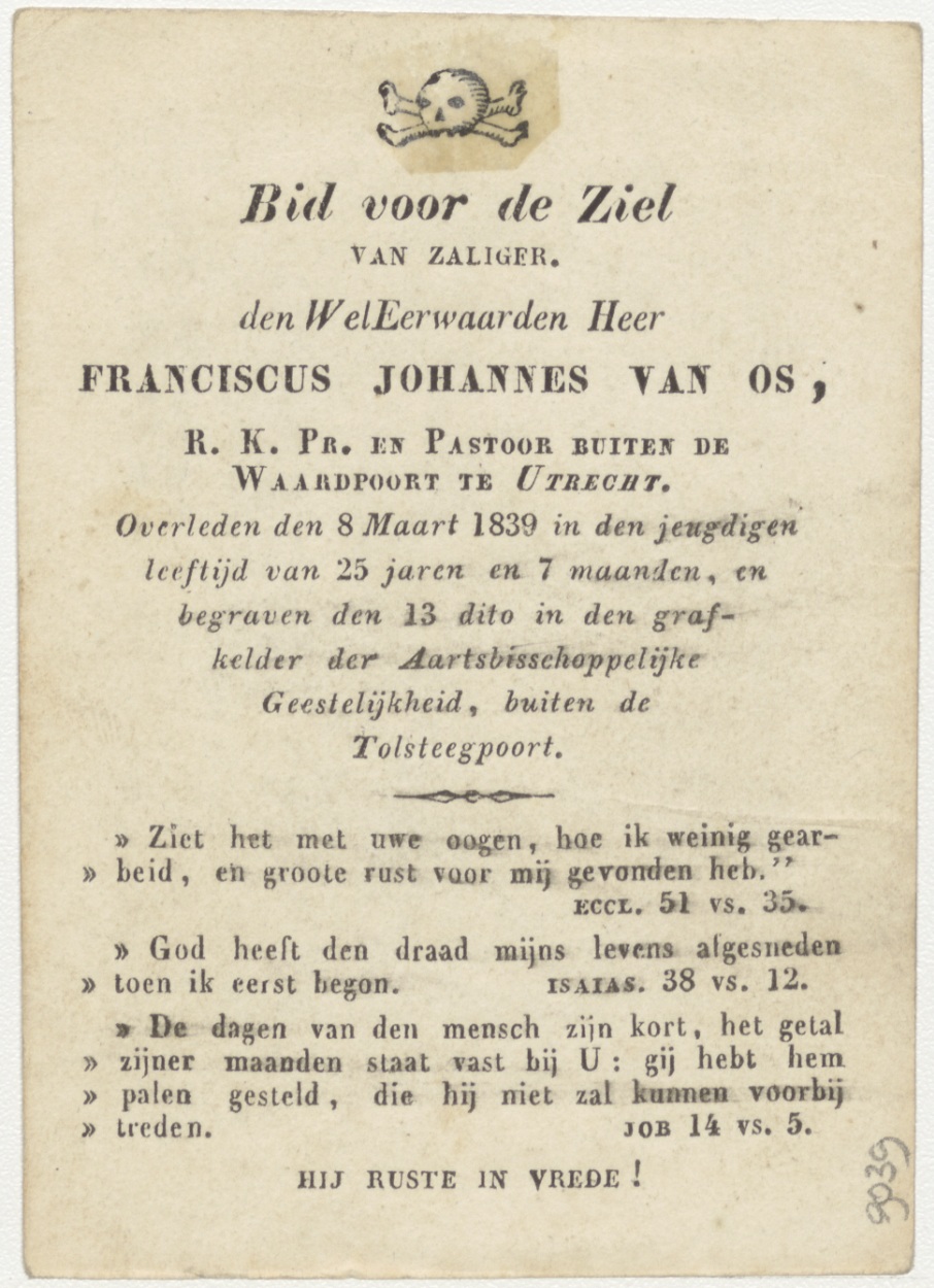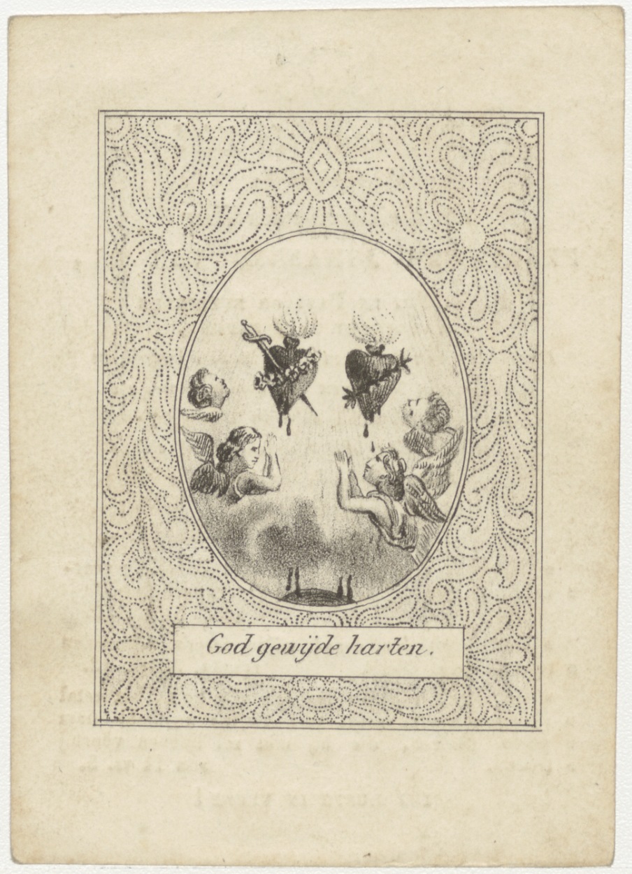 Twee harten, God gewijde harten, kz. Religieus; bid voor ziel Franciscus van Os (+1839) pastoor buiten de waardpoort te Utrecht