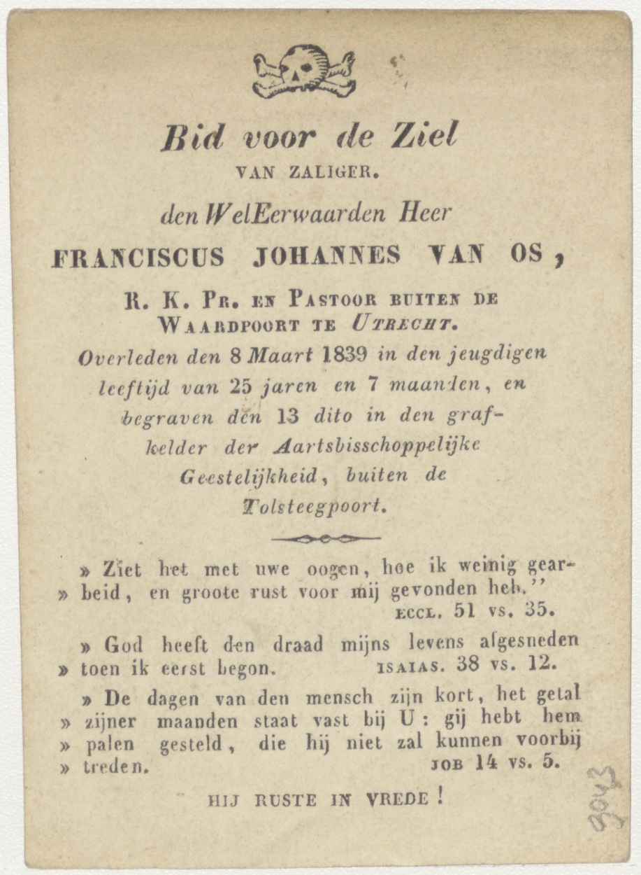Hoogmoed en nederigheid, kz. Religieus; bid voor ziel Franciscus van Os (+1839) pastoor buiten de waardpoort te Utrecht