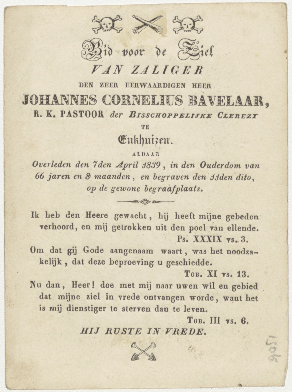Schildpad en haan; traagheid en waakzaamheid, kz. Religieus; bid voor ziel Johannes Bavelaar (+1839) pastoor bisschoppelijke clerezy te Enkhuizen