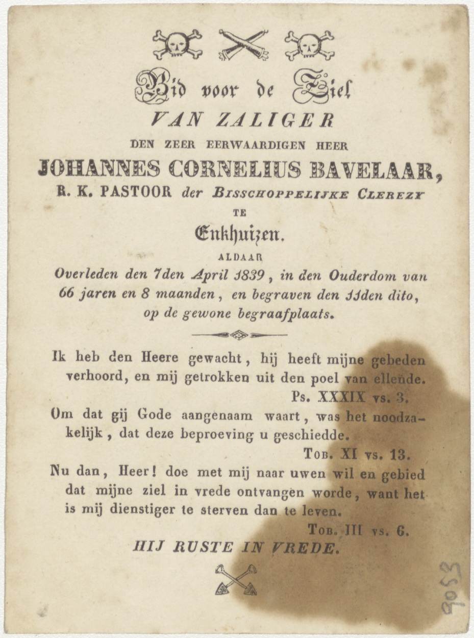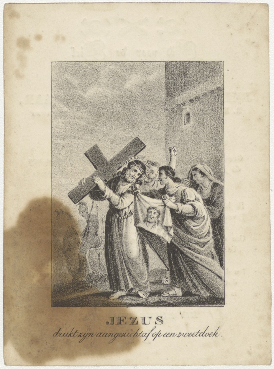 Christus drukt zijn aangezicht op de zweetdoek van Veronica, kz. Religieus; bid voor ziel Johannes Bavelaar (+1839) pastoor bisschoppelijke clerezy te Enkhuizen