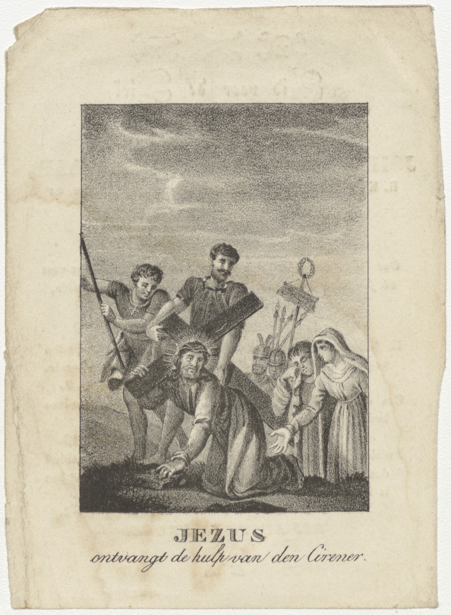 Christus ontvangt hulp van Simon de Cirener, kz. Religieus;Bid voor ziel pastoor Johannes Cornelius Bavelaar (+1839), Enkhuizen