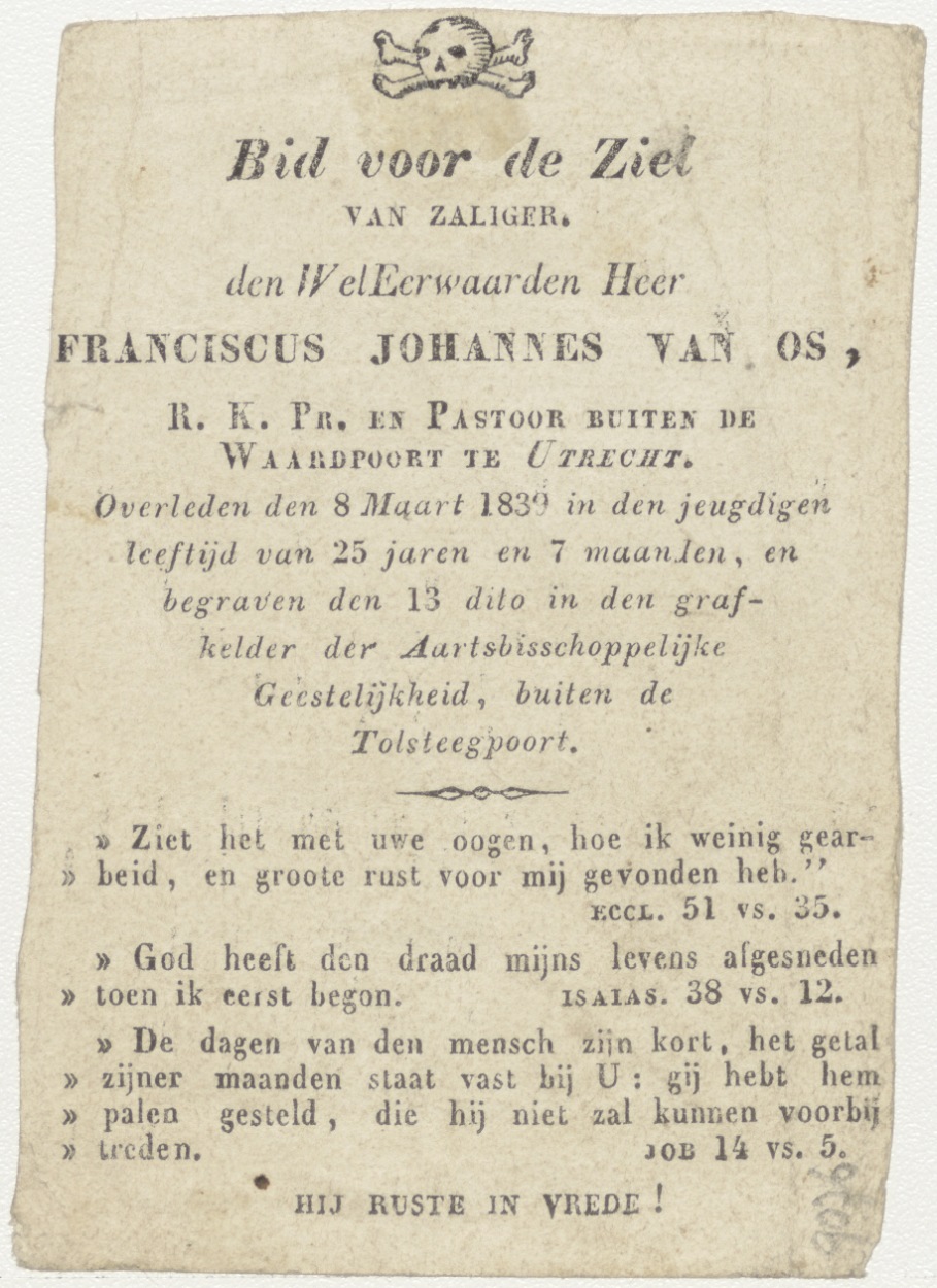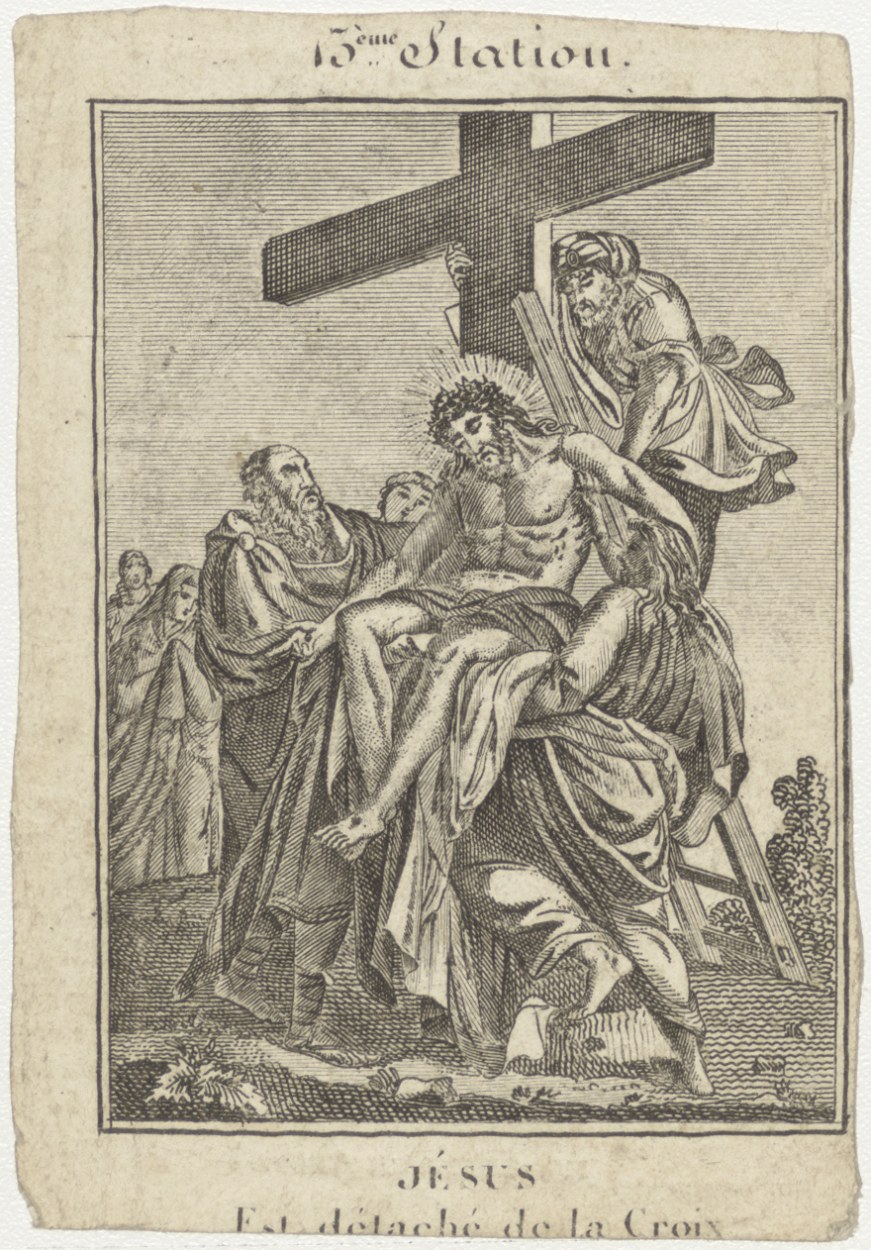 Passiescène (13e statie) Christus kruisafneming (Frans), kz. Religieus; bid voor ziel Franciscus van Os (+1839) pastoor buiten de waardpoort te Utrecht