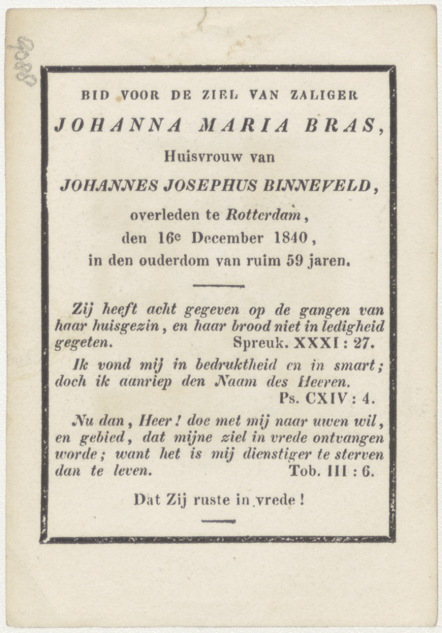 H. Sacrament: priesterwijding (Frans), kz. Bid voor ziel Johanna Maria Bras (+1840) Rotterdam, huisvrouw van Johannes Josephus Binneveld