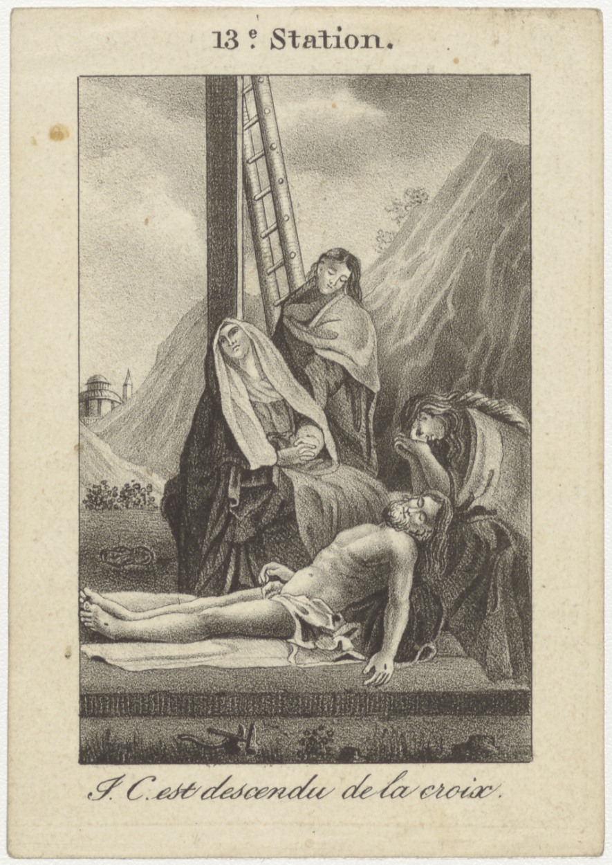 Passiescène (13e statie) Christus wordt van het kruis afgehaald (Frans), kz. Bid voor ziel Heyligers (+1840) Schiedam