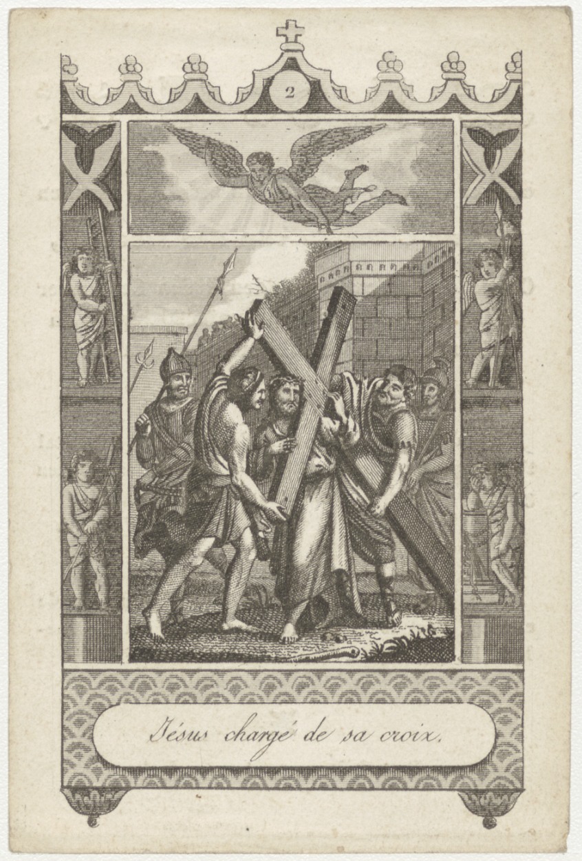 Passie (2e statie) Christus draagt het kruis (Frans), kz. Bid voor ziel Van der Hoeven (+1840) Schiedam
