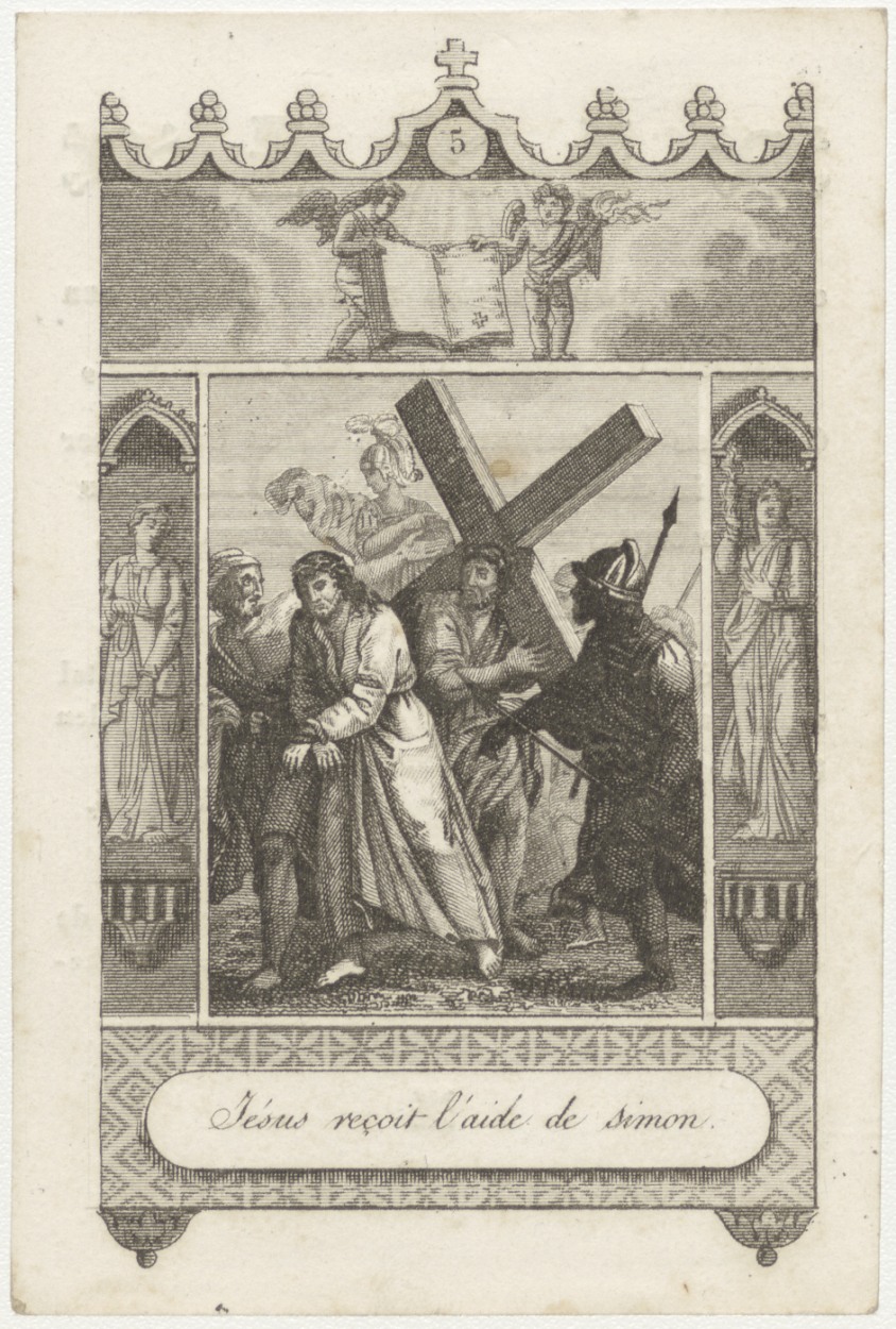 Passiescène (5e statie) Christus krijgt hulp van Simon van Cirene (Frans), kz. Bid voor ziel van der Heeven (+1840) Schiedam