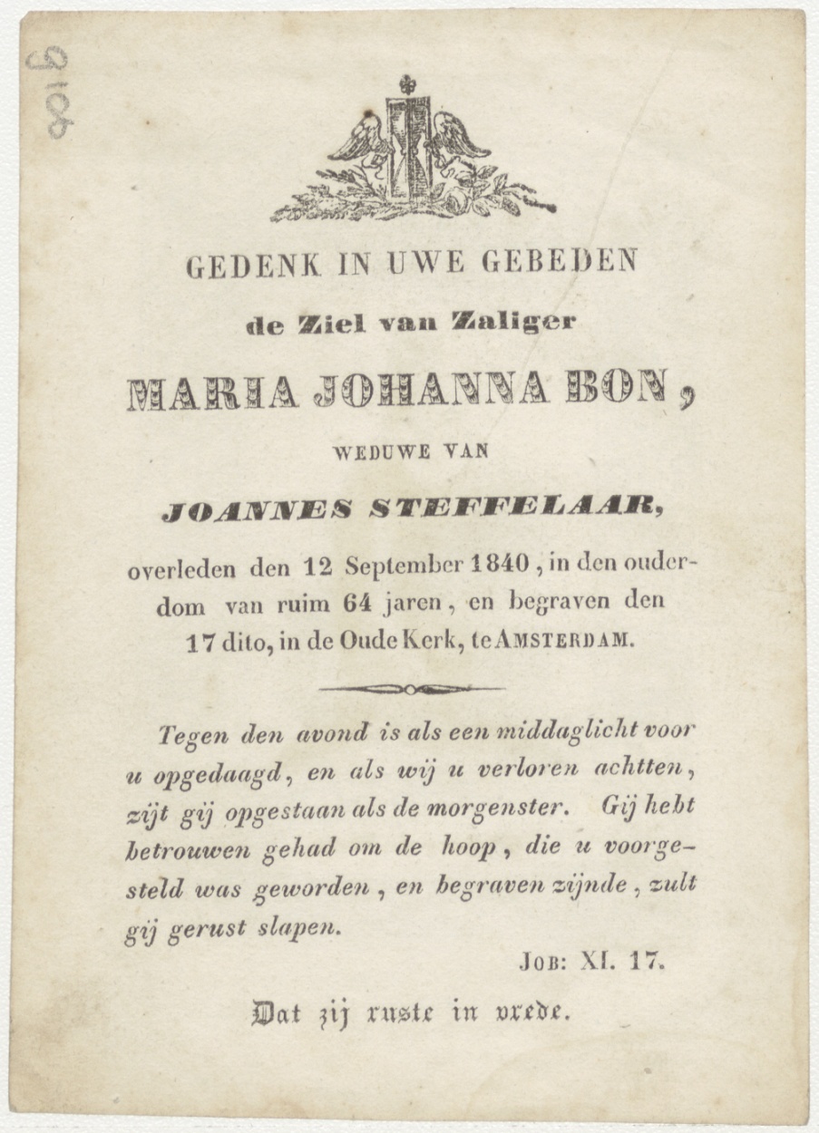 Maria, moeder van God (Frans), kz. Bid voor ziel Bon-steffelaar (+1840) Amsterdam