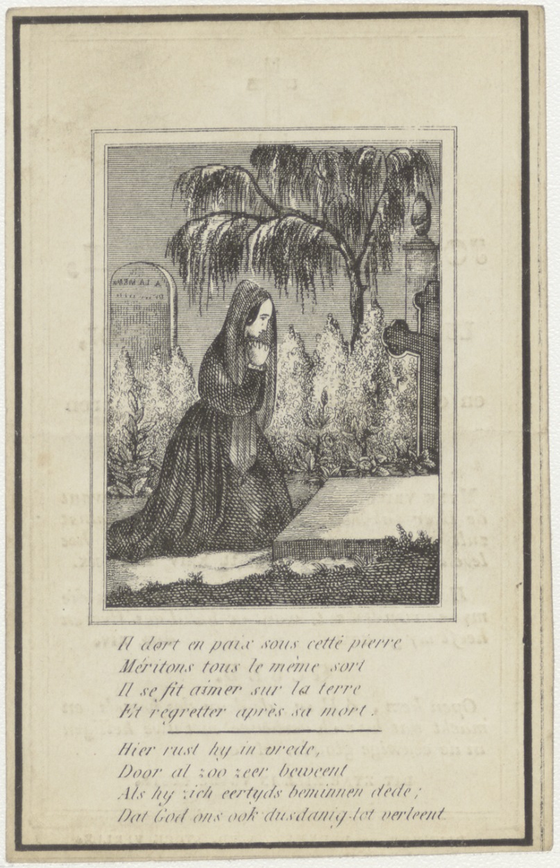 Vrouw bij grafzerk; hij rust in vrede, kz. Bid voor ziel d'Haane-Gheldof (+1840) Dixmude