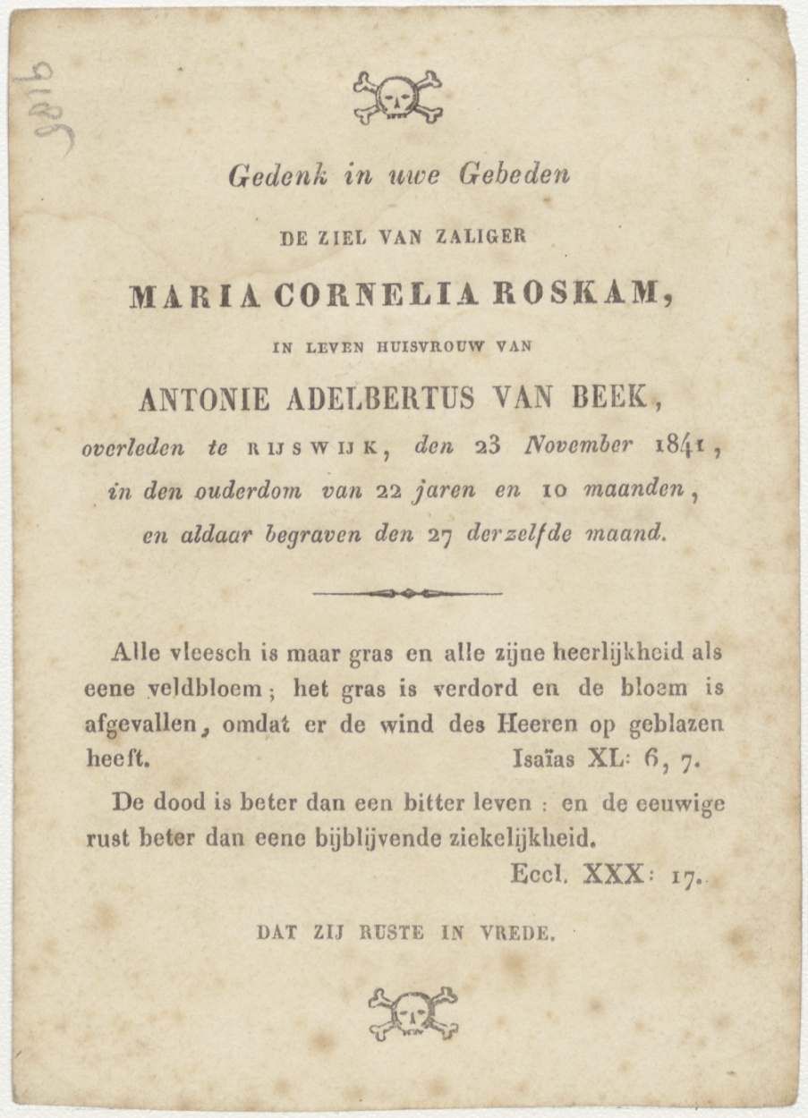 H. Hortense, kz. Bid voor ziel Maria Cornelia Roskam (+1841) Rijswijk, huisvrouw van Antonie Adelbertus van Beek