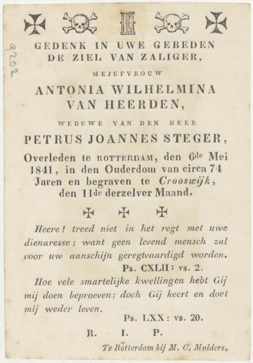 Maria met engelen (Frans), kz. Bid voor ziel Steger-van Heerden (+1841) Rotterdam