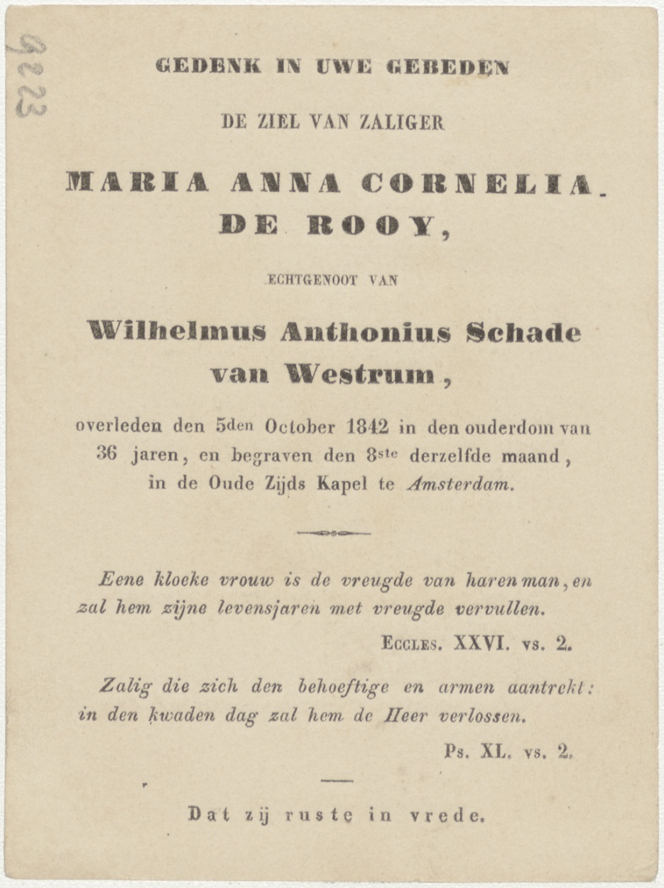 Maria Onbevlekte Ontvangenis (Frans), Bid voor ziel Maria Anna Cornelia de Rooy (+1842) Amsterdam, weduwe van Wilhelmus Antonius Schade van Westrum