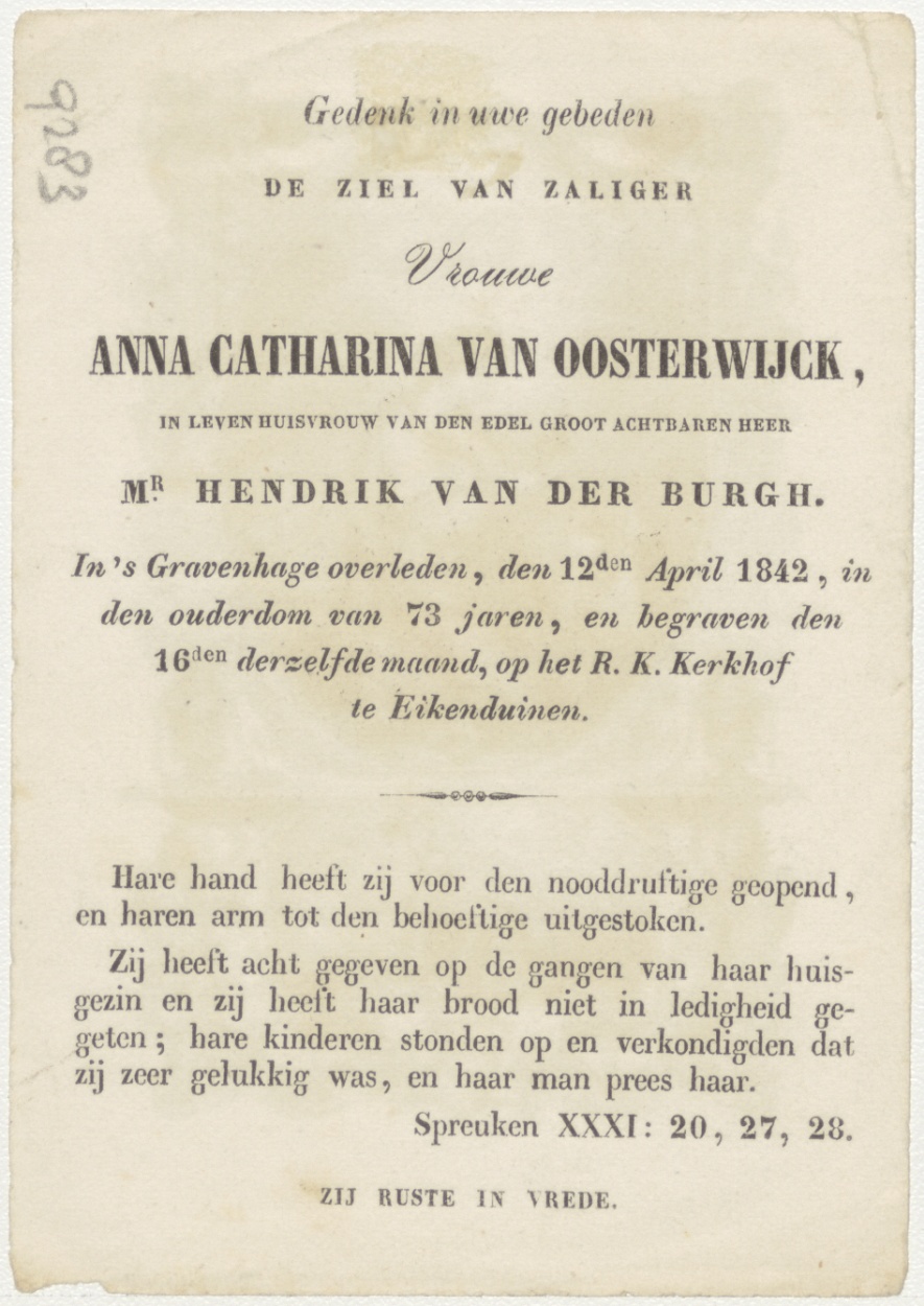 H. Zoé (Frans), kz. Bid voor ziel Van der Burgh-Van Oosterwijck (+1842) 's-Gravenhage
