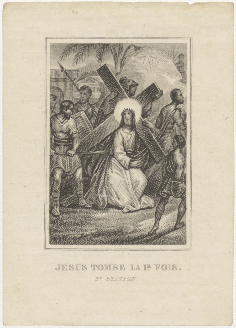 Passiescène (3e statie) Christus valt voor de erste maal (Frans), kz. Bid voor ziel Sauveur (+1842) Rotterdam