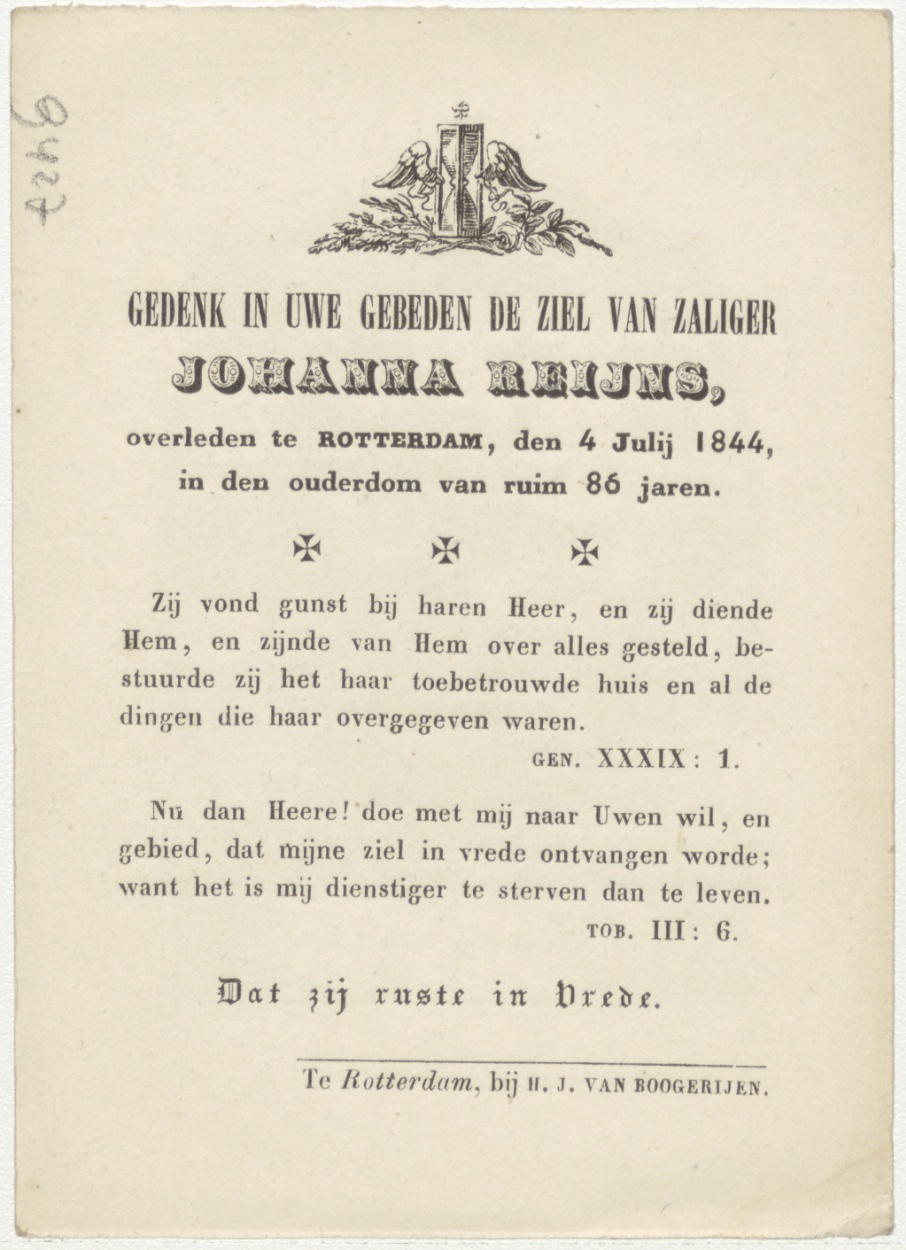 Gij weet dag noch uur, kz. Bid voor ziel Reijns (+1844) Rotterdam