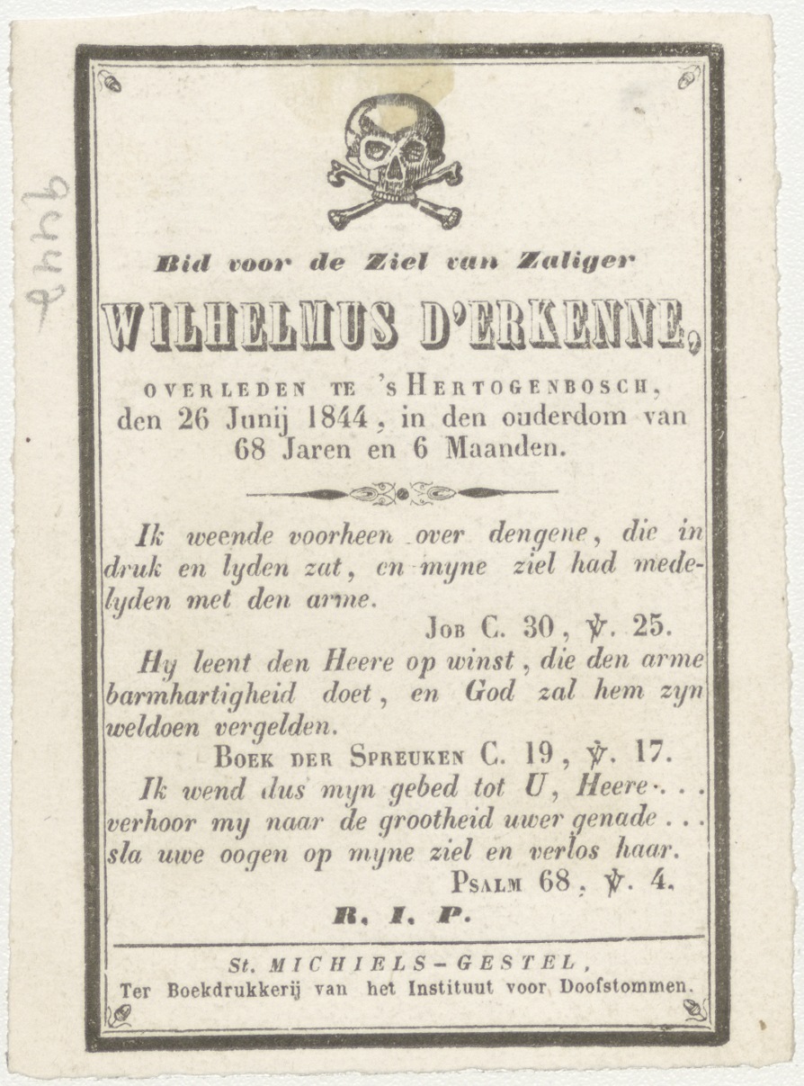 Maria met twee biddende kinderen (Frans), kz. Bid voor ziel d' Erkenne (+1844) 's-Hertogenbosch