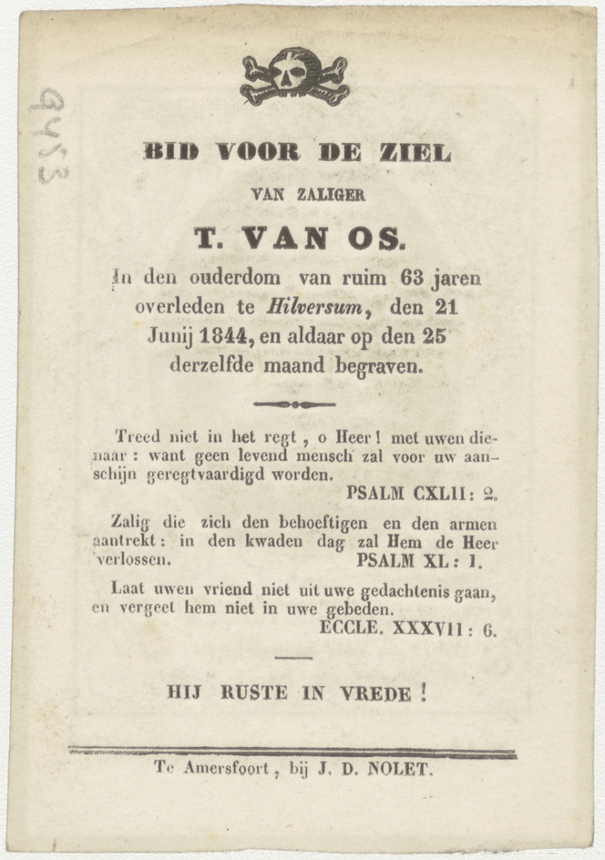 Met hare verschijning vlugt de duysternis, kz. Bid voor ziel Van Os (+1844) Hilversum