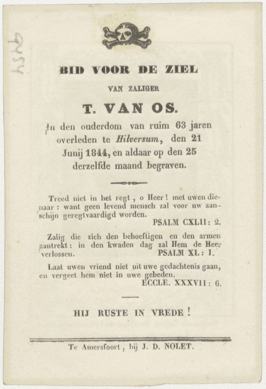 O Heer doet uw aanschijn voor... Veronicadoek, kz. Bid voor ziel Van Os (+1844) Hilversum