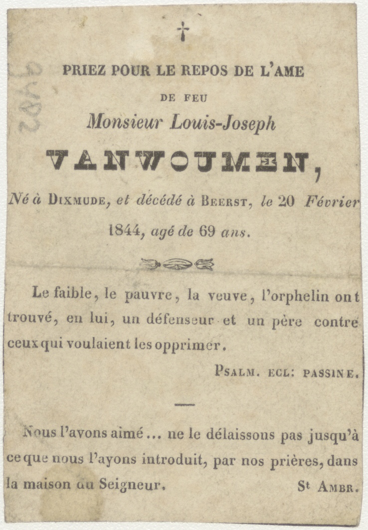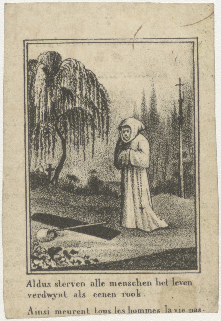 Aldus sterven alle menschen het leven verdwijnt als eenen rok, grafscène, kz. Bid voor ziel Louis-Joseph Vanwoumen (+1844) Beerst (Frans)