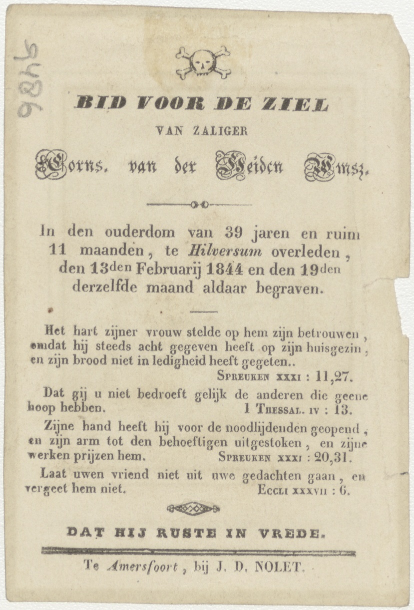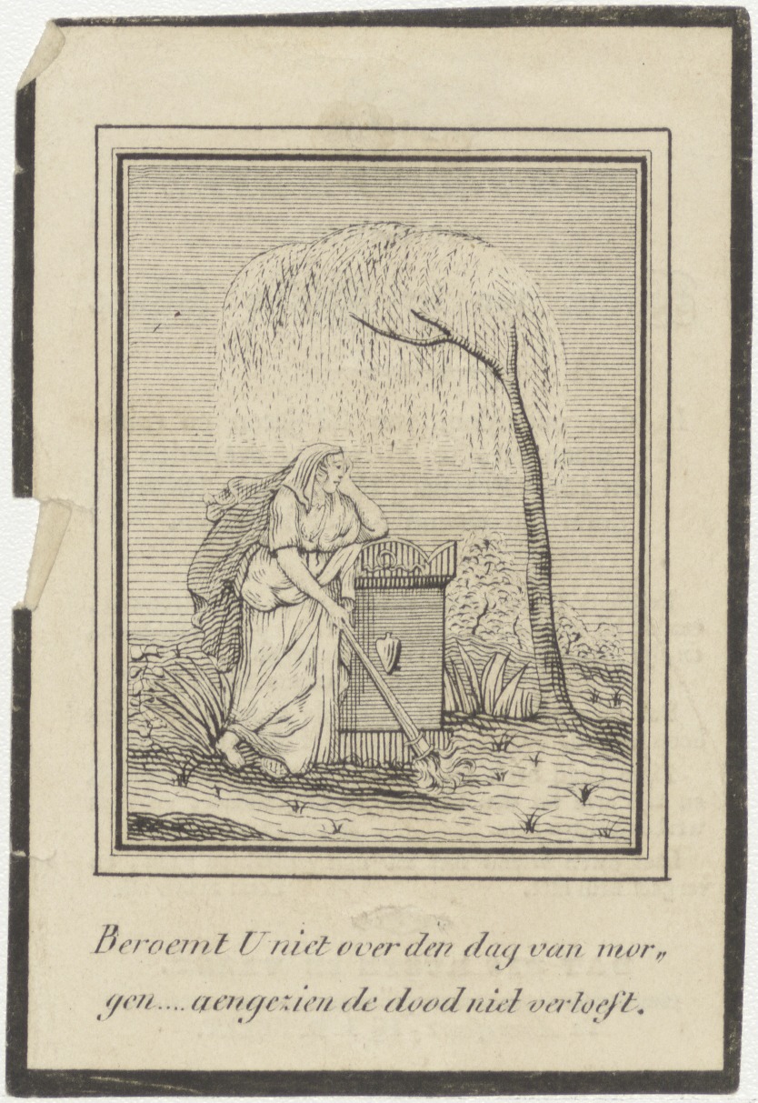 Beroemt u niet over den dag van morgen... kerkhofscène, kz. Bid voor ziel Van der Leiden Willemsz (+1844) Hilversum