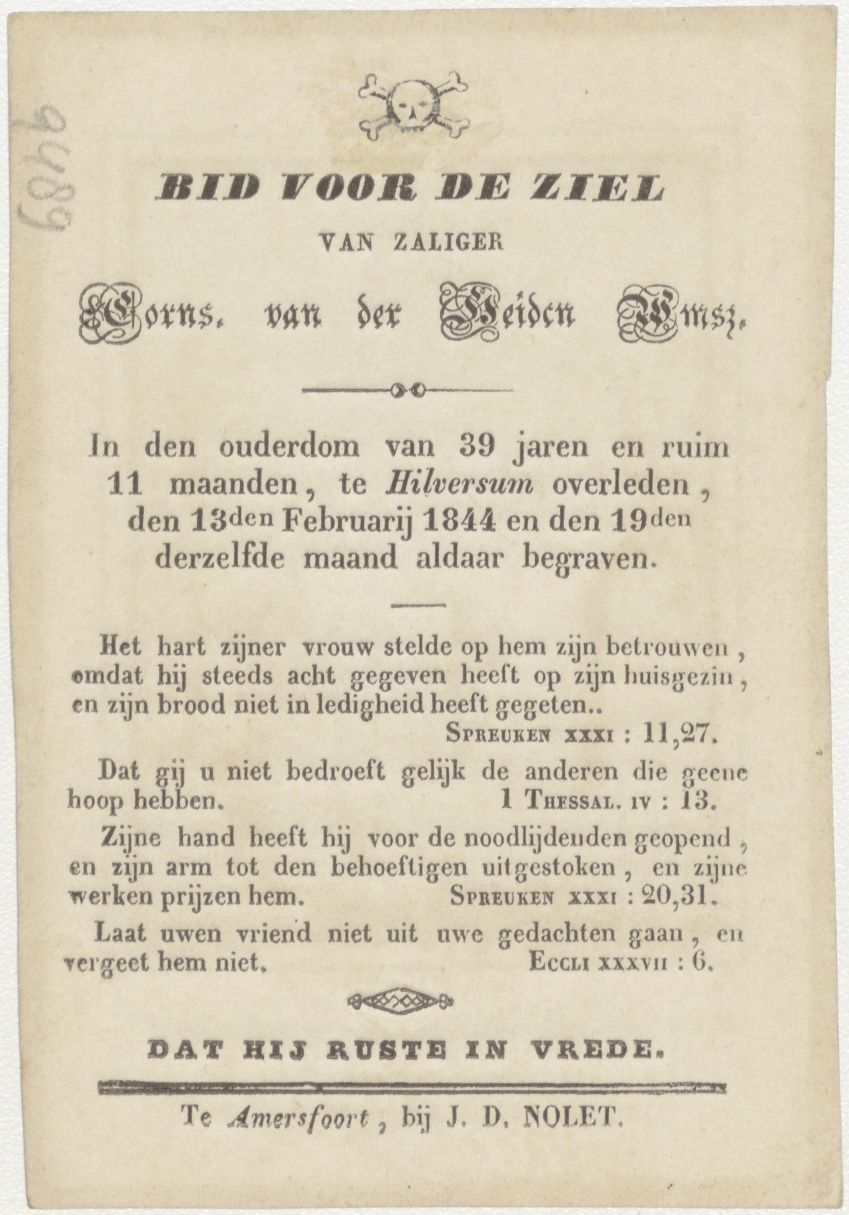 Wees de afgestorven gedachtig..., kz. Bid voor ziel Van der Leiden Willemsz (+1844) Hilversum