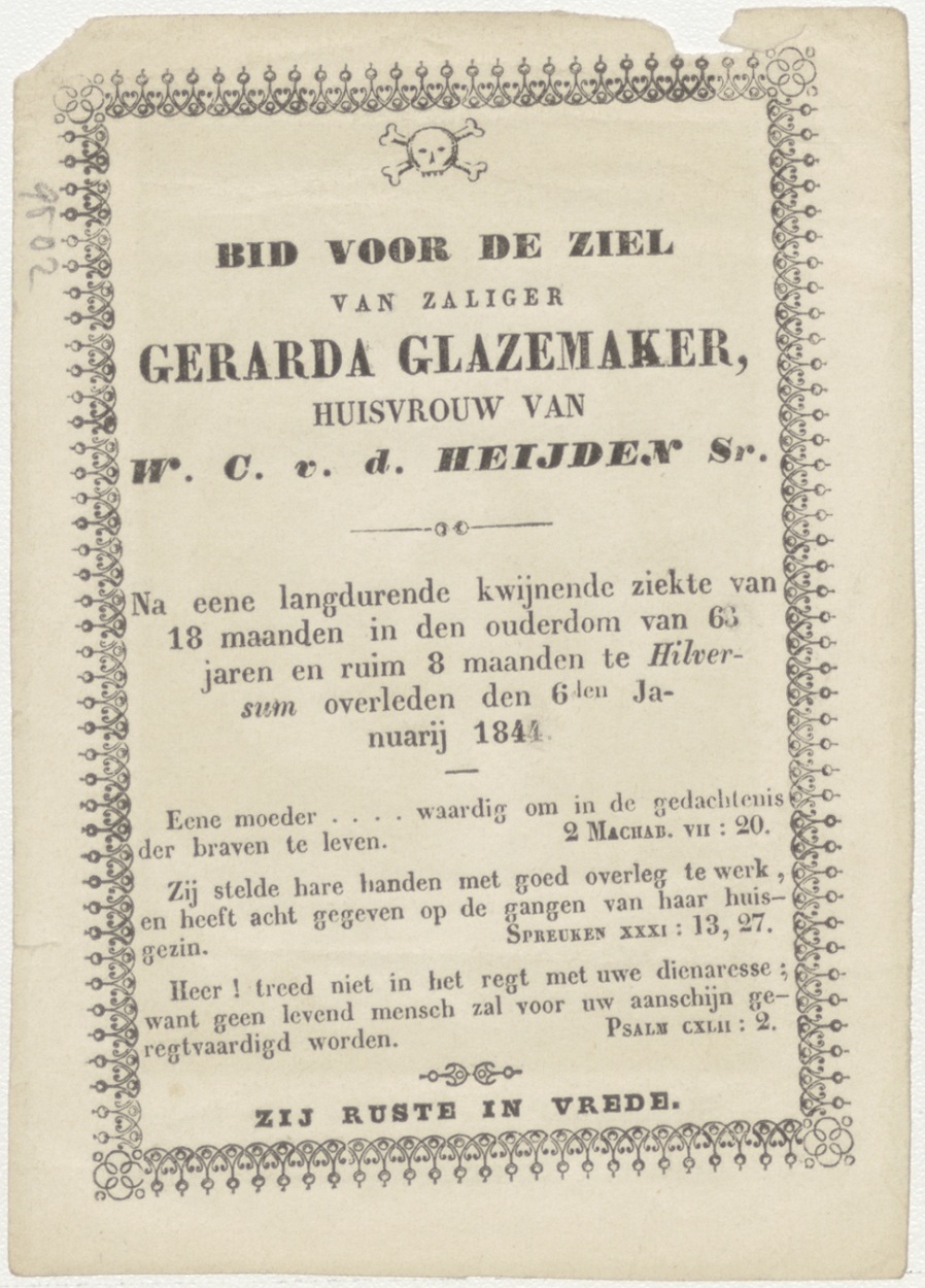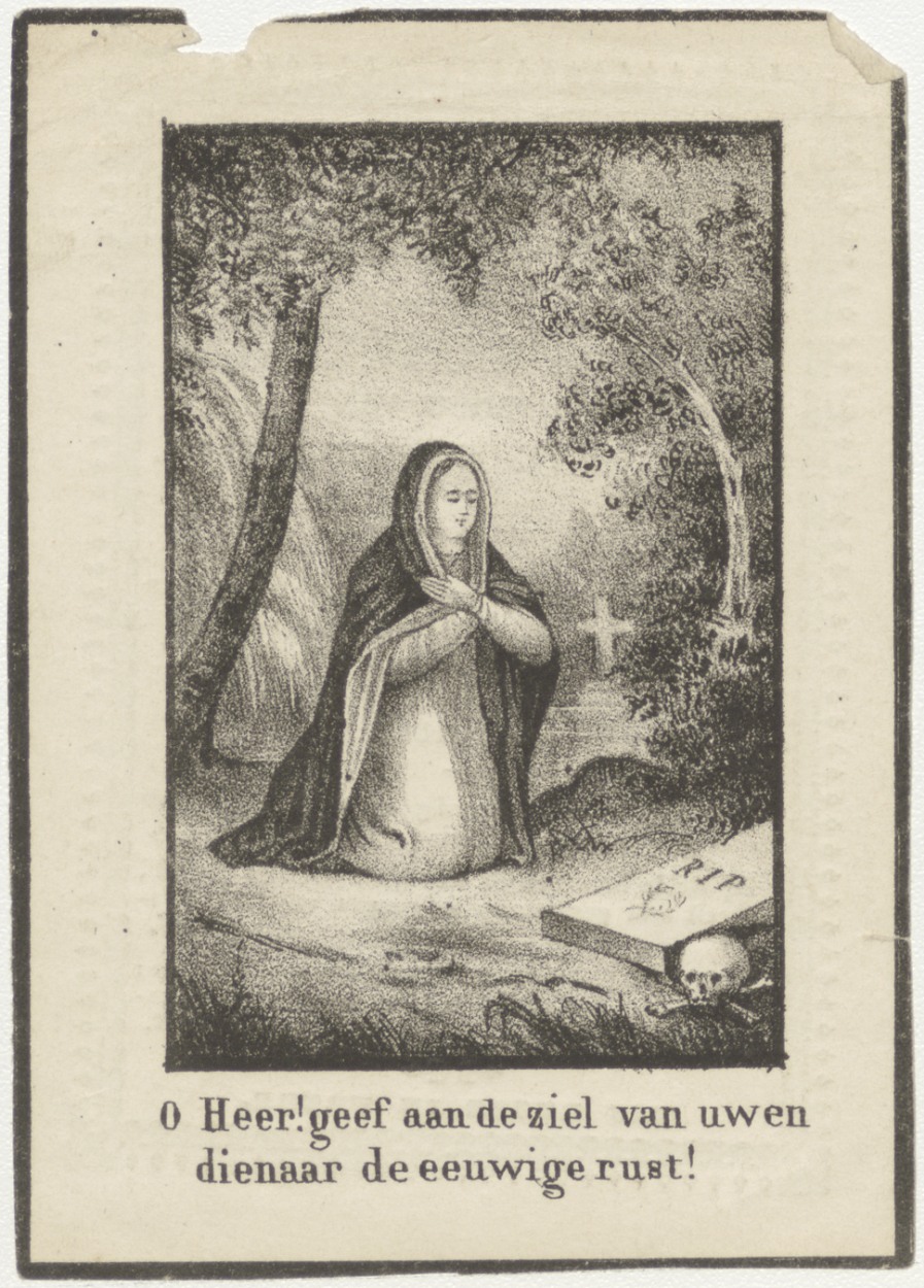 O Heer, geef aan de ziel van uwen dienaar de eeuweige rust... kerkhofscène, kz. Bid voor ziel Glazenaar-van der Heyden (+1844) Hilversum