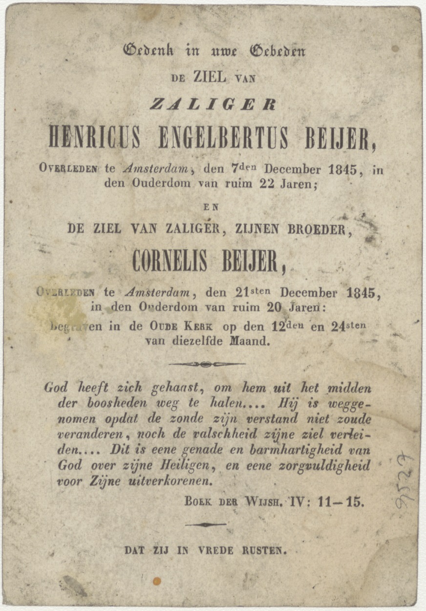 Goddelijke wetten, kz. Bid voor ziel Beyer (+1845) Rotterdam, dubbelgebruik twee broers 7 en 21 dec.