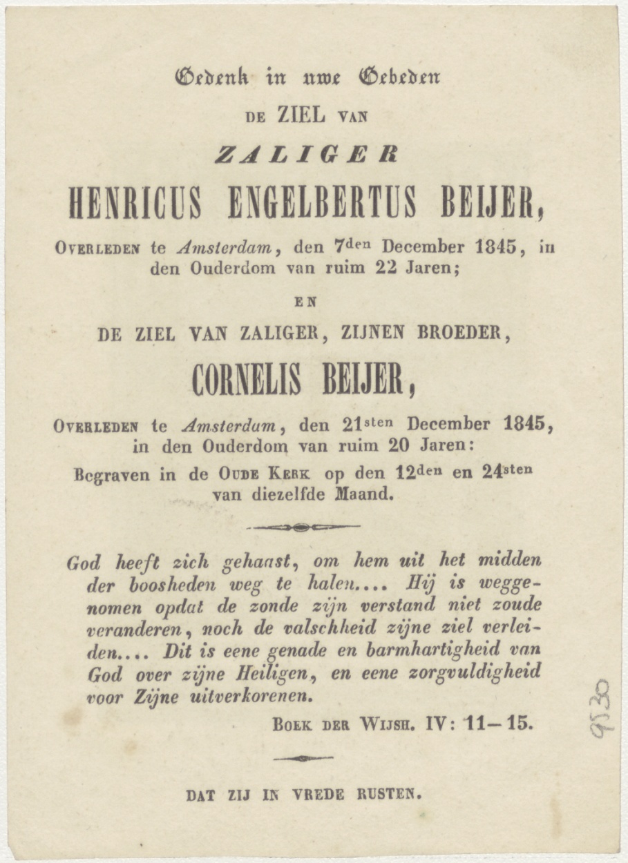 In dit teken zult gij overwinnen, kz. Bid voor ziel Beyer (+1845) dubbelgebruik twee broers overleden 7 en 21 dec. Amsterdam