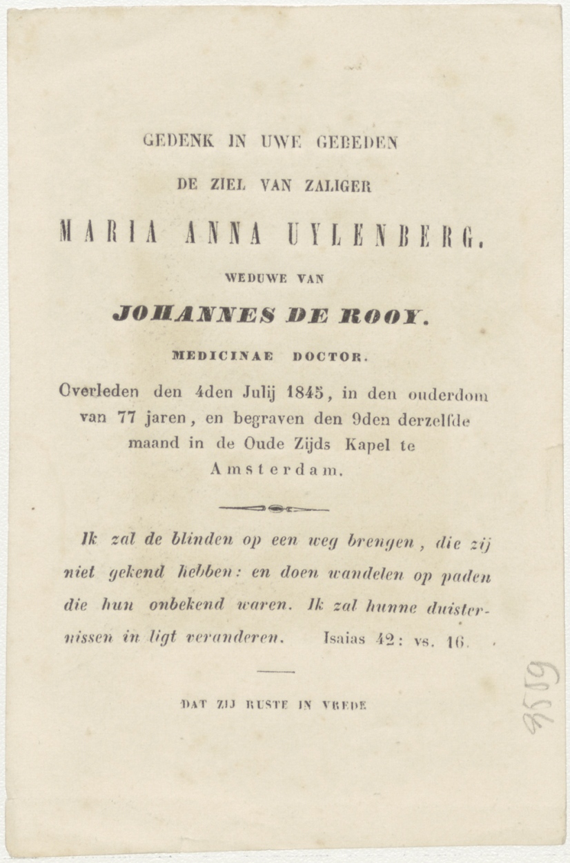 Maria, hulp van de lijdenden (Frans), kz. Bid voor ziel Kuylenberg-de Rooy (+1845) Amsterdam