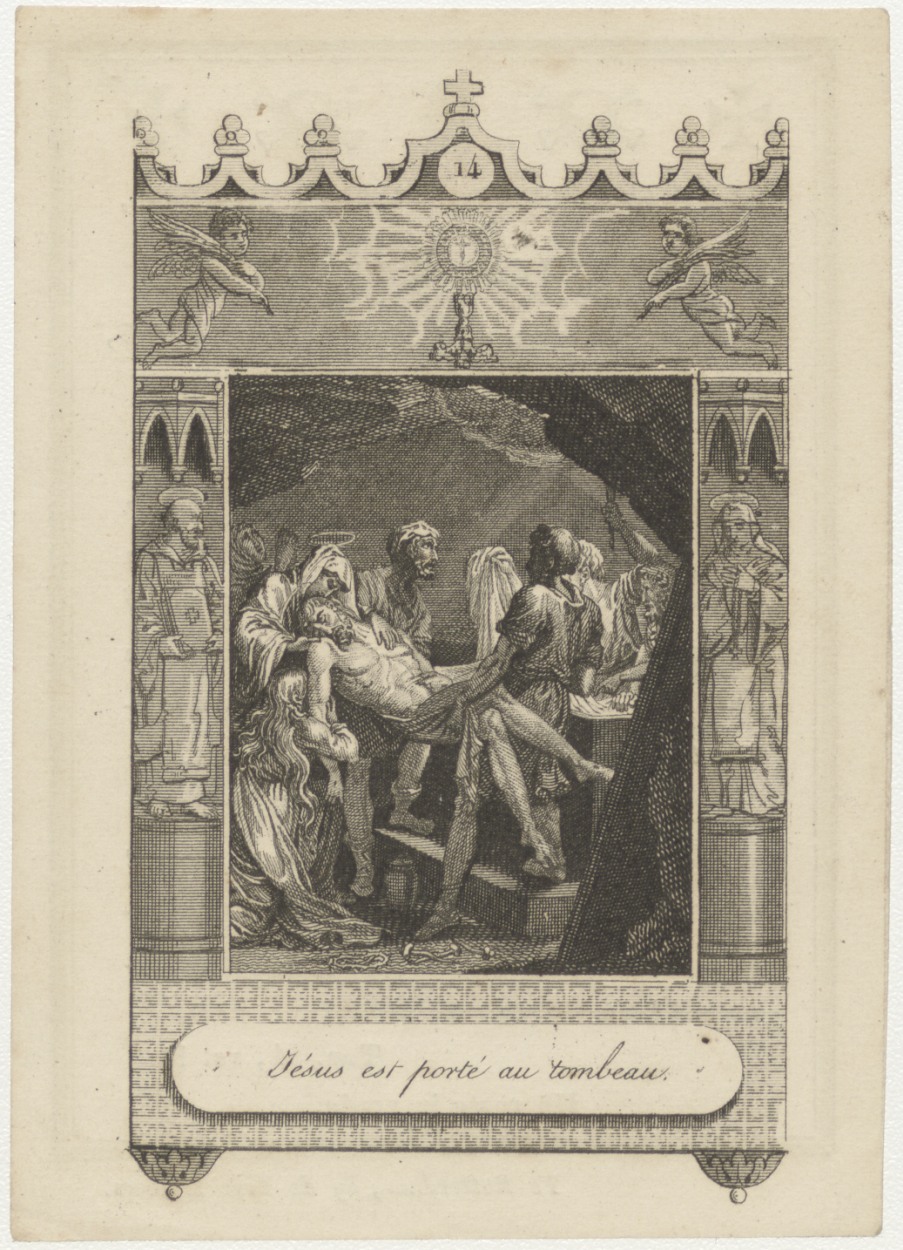 Passiescène (14e statie) Christus wordt in het graf gelegd (Frans), kz. Bid voor ziel Heykamp (+1845) Utrecht