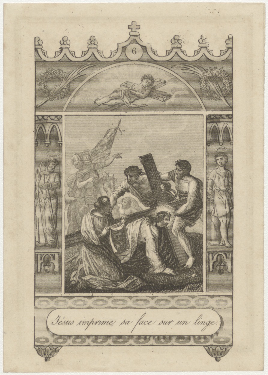 Passiescène (6e statie) Christus droogt zijn gezicht, veronicadoek (Frans), kz. Bid voor ziel Heykamp (+1845) Utrecht