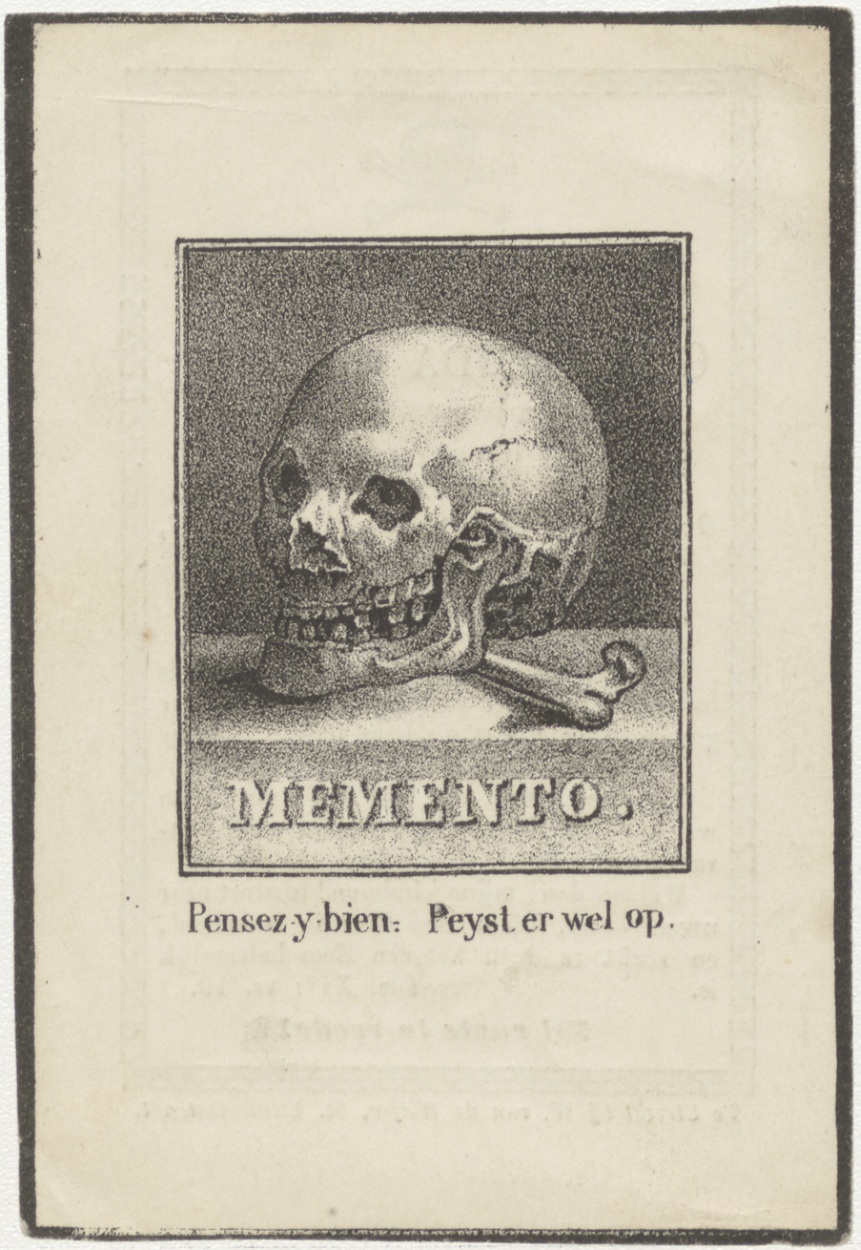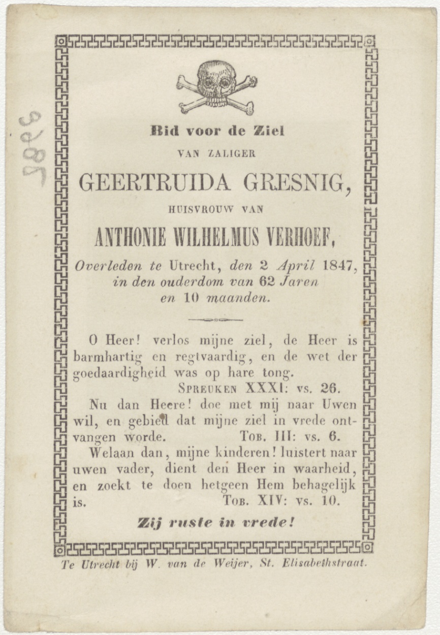 Prijst er wel op, monts morie (Frans-Nederlands), kz. Bid voor ziel Verhoef-Gresig (+1847) Utrecht