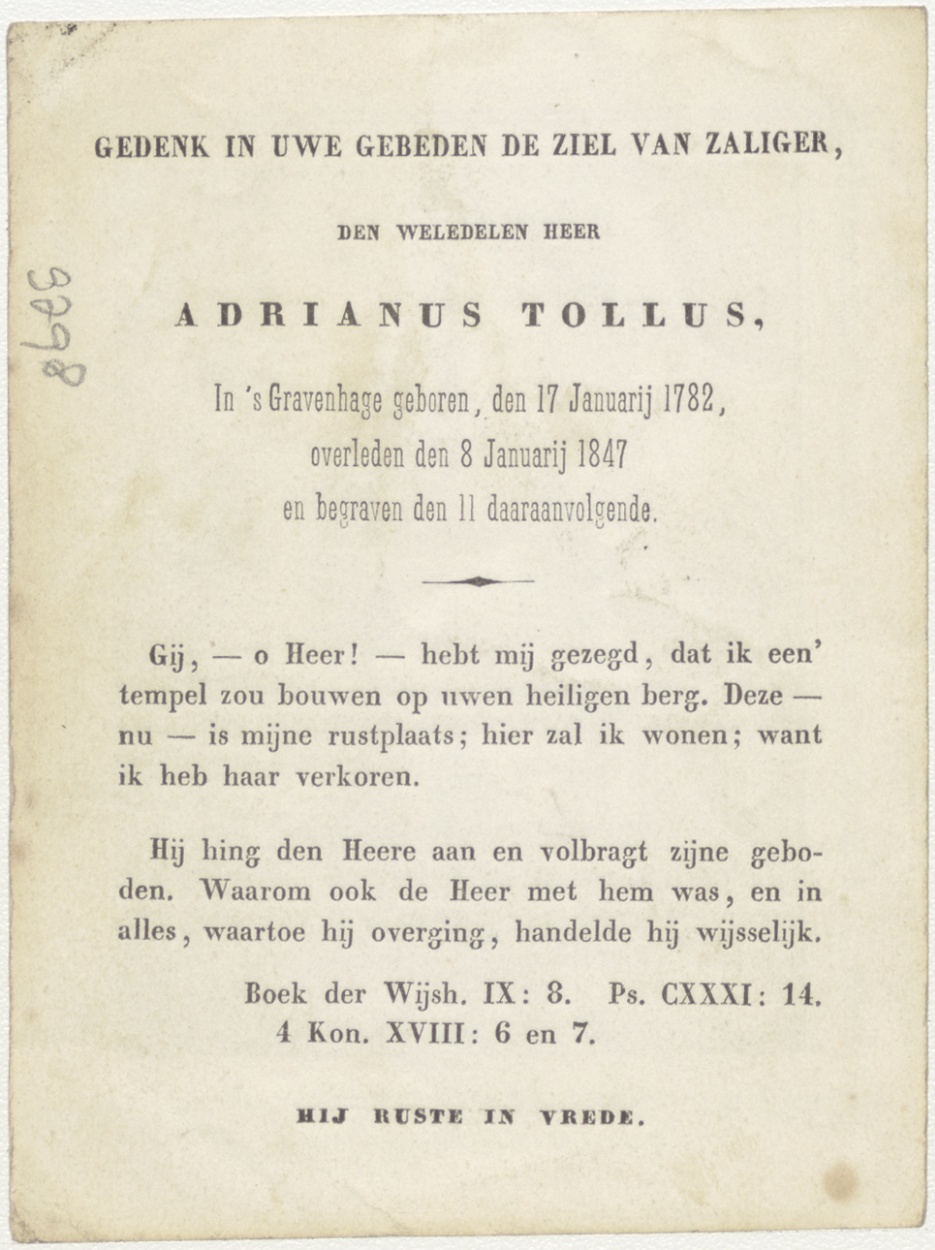 Kerk, kz. Bid voor ziel Tollus (+1847) 's-Gravenhage