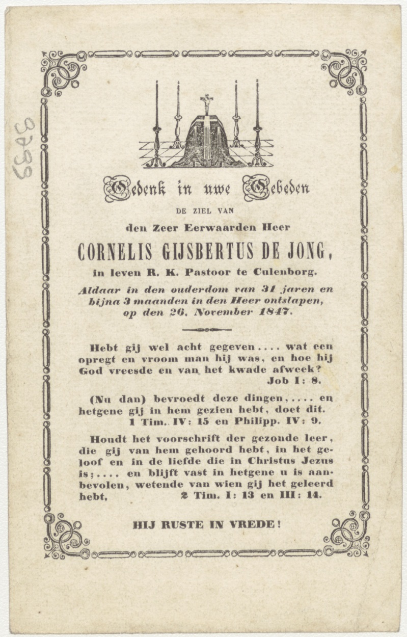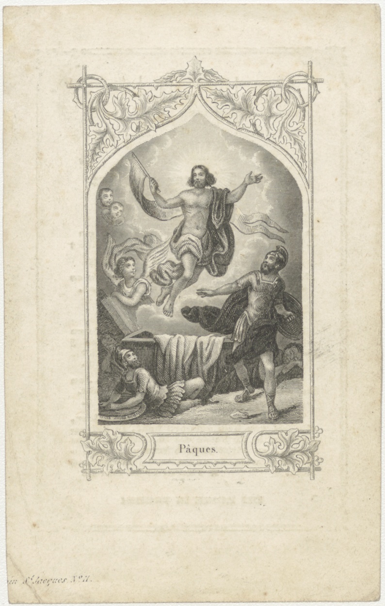 Pasen, verrijzenis van Christus (Frans), kz. Religieus; bid voor ziel Cornelis de Jong (+1847) pastoor te Culemborg