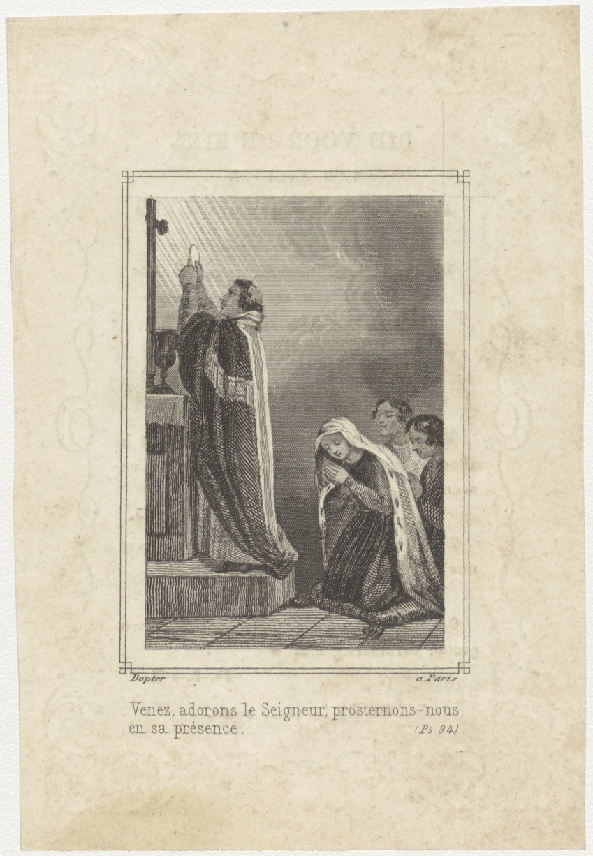 Altaarscène, priester houdt de hostie omhoog met publiek (Frans), kz. Bid voor ziel Kuypers (+1847) Burgward