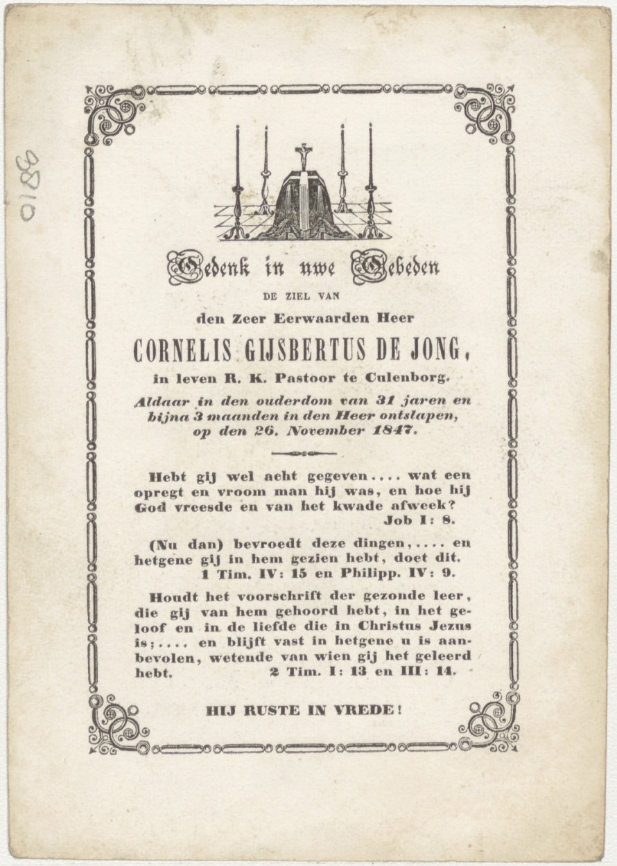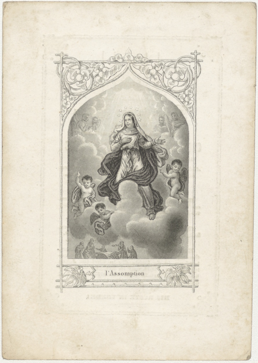 Opneming van Maria in de hemel (Frans), kz. Religieus; bid voor ziel De Jong (+1847) pastoor te Culenborg