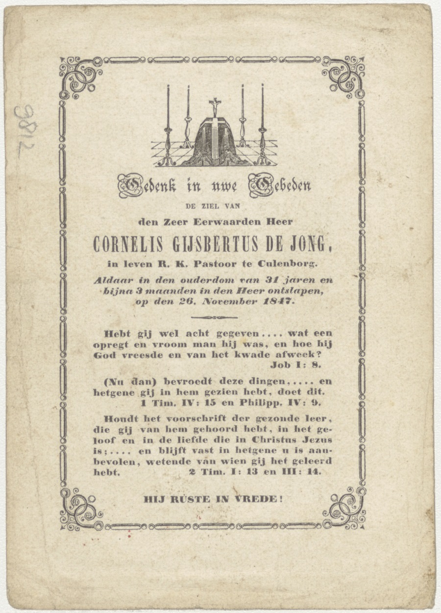 Pinksteren, nederdaling H. Geest (Frans), kz. Religieus; bid voor ziel De Jong (+1847) pastoor te Culenborg