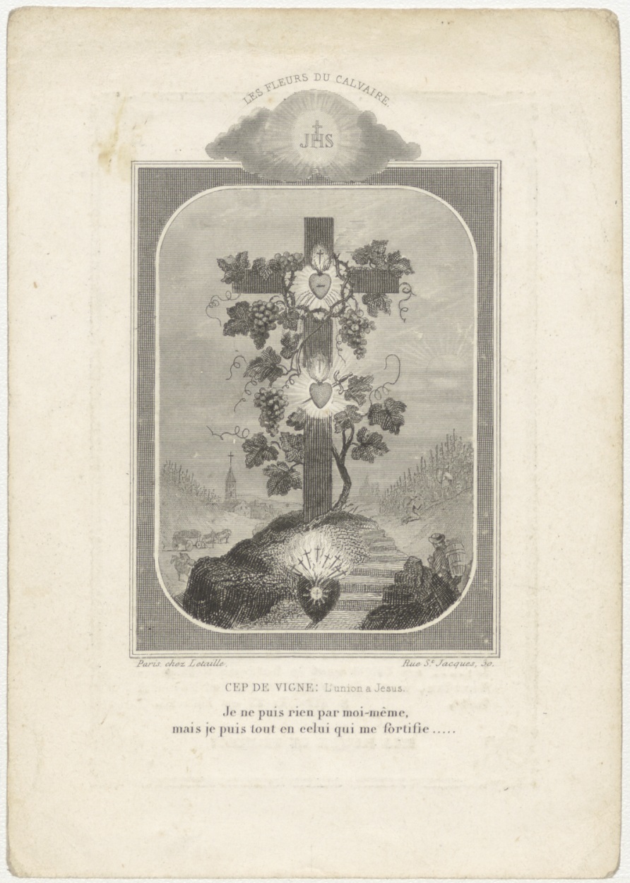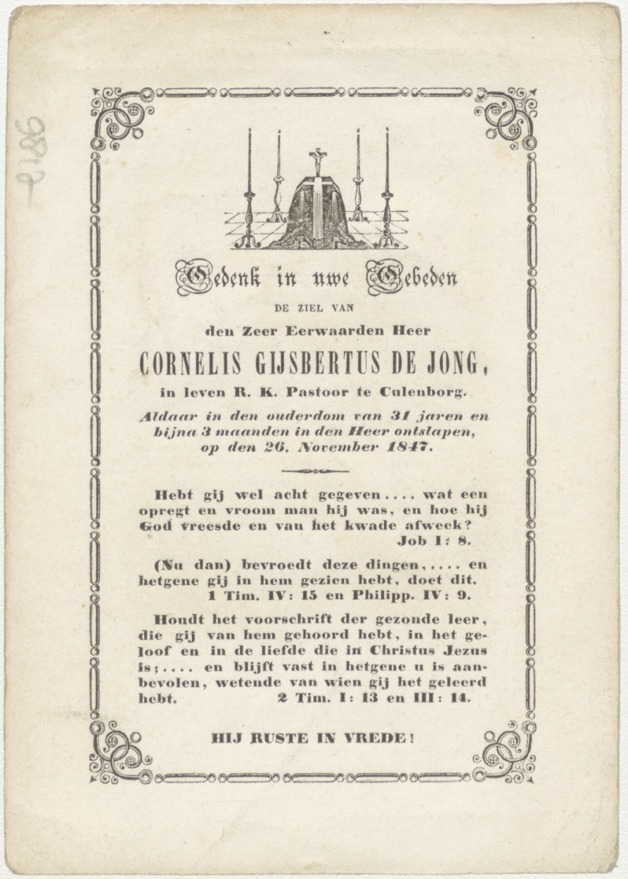 H. Kruis met wijnranken en H. Hart (Frans), kz. Religieus; bid voor ziel De Jong (+1847) pastoor te Culenborg