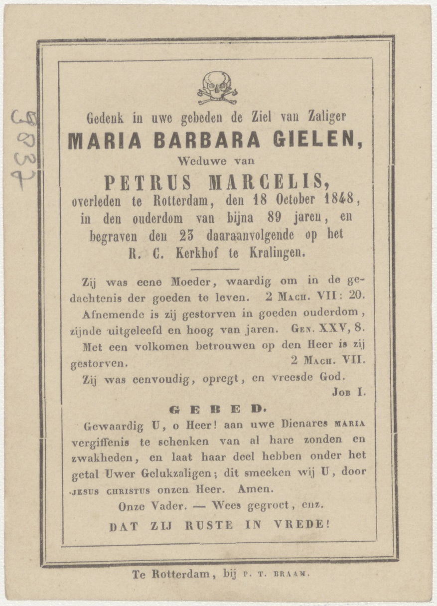 Wij zijn getroffen door de .. (Frans) aanbidding van het kruis, kz. Bid voor ziel Maria Barbara Gielen (+1848) Rotterdam, echtgenote van Petrus Marcelis