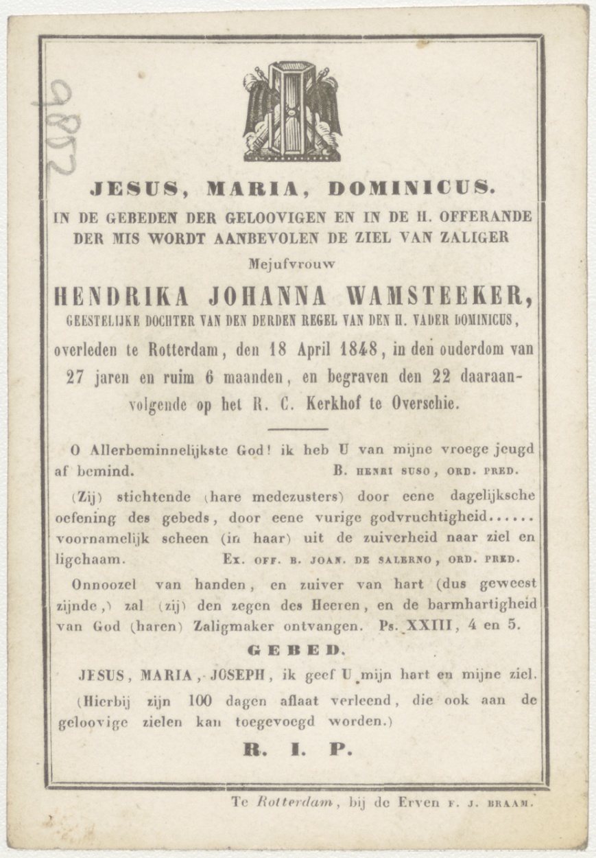 Aanbidding der koningen (Frans), kz. Bid voor ziel Hendrika Johanna Wamsteeker (+1848) geestelijk dochter derde regel H. Dominicus R.dam