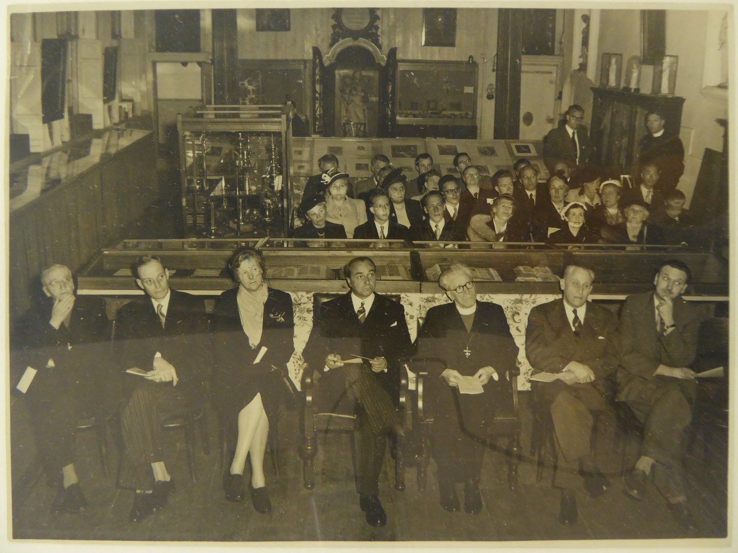 Portret van genodigden bij de opening van de expositie over Port-Royal in het Oud-Katholiek Museum (Getrudiskapel) te Utrecht op 28 mei 1953. Van links naar rechts opde voorste rij: Mgr. Engelbertus Lagerwey, bisschop van Deventer, directeur van het museum prof. dr. V.J. Koningsberger, rector-magnificus van de Rijksuniversiteit Utrecht mw. De Ranitz-de Brauw, namens burgemeester De ...