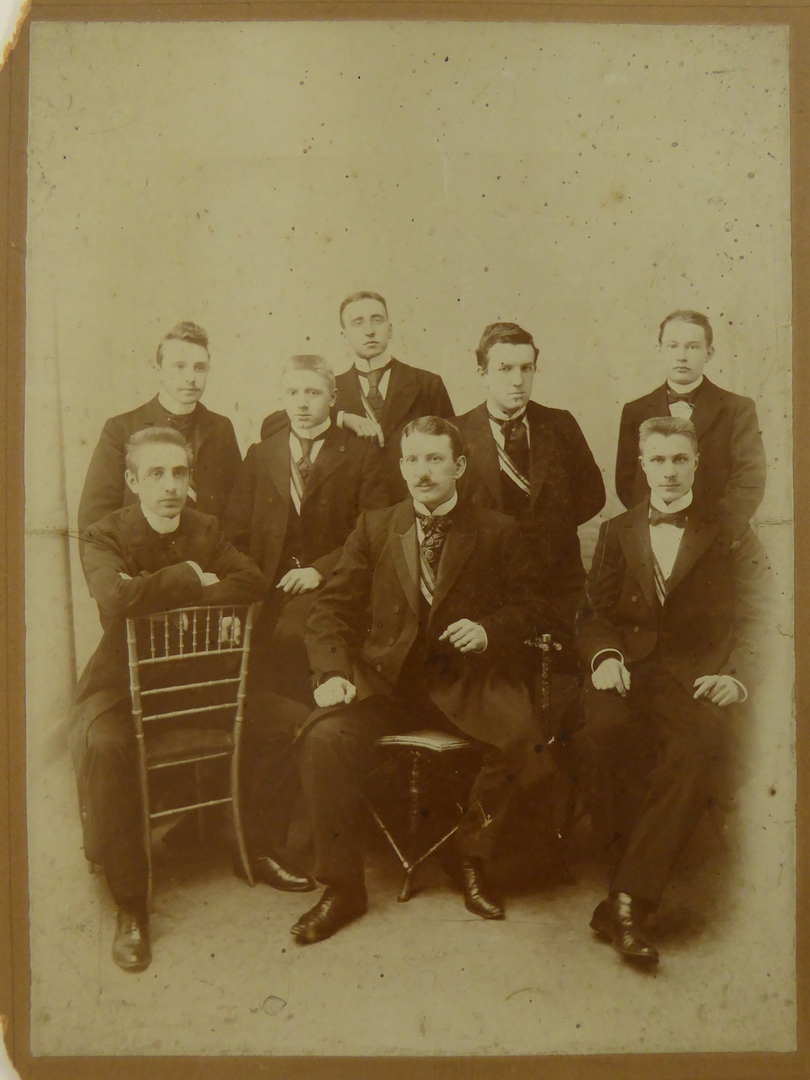 Acht jonge mannen, de Activitas van de oud-katholieke studentenvereniging Batavia, in december 1902